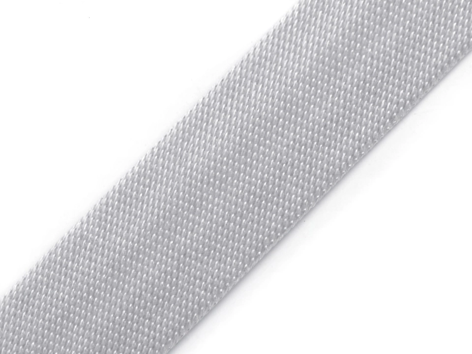 Атласная косая бейка светло-серого цвета шириной 15 мм. Косая бейка - это прикладная лента с заблаговременно подогнутыми припусками. Своим названием косая бейка обязана способу производства из ткани, нарезанной под углом в 45 градусов. Используется в качестве отделки, для обработки бортовых срезов, горловины, низа рукавов в женской одежде. Бейка достаточно мягкая, легко укладывается по закругленным срезам без складок и перекосов.