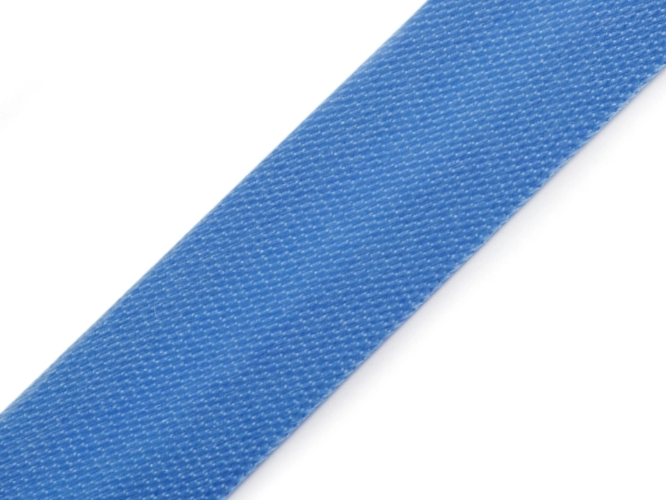 Атласная косая бейка голубого цвета шириной 15 мм. Косая бейка - это прикладная лента с заблаговременно подогнутыми припусками. Своим названием косая бейка обязана способу производства из ткани, нарезанной под углом в 45 градусов. Используется в качестве отделки, для обработки бортовых срезов, горловины, низа рукавов в женской одежде. Бейка достаточно мягкая, легко укладывается по закругленным срезам без складок и перекосов.
