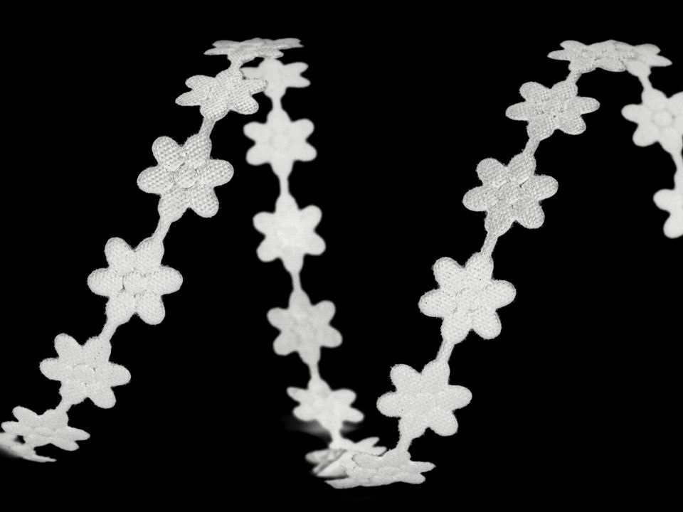Декоративная отделочная лента в виде меленьких цветочков белого цвета. Размер цветка 0,8 х 0,8 см. Пригодится и для шитья, и для упаковки подарков, и для создания поделок из текстиля. Для скрапбукинга, рукоделия, шитья игрушек, создания украшений.