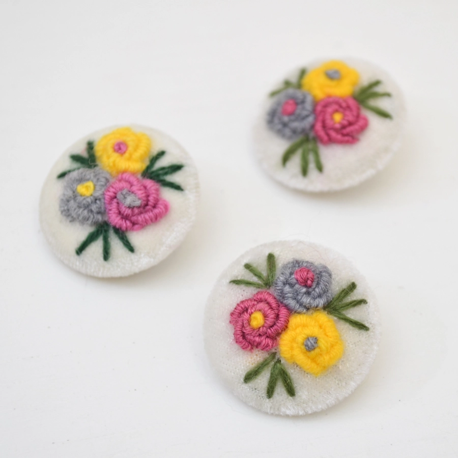 Пришивные декоративные пластиковые пуговицы на ножке из пластика обтянуты белым бархатом и вышитыми объемными цветами.