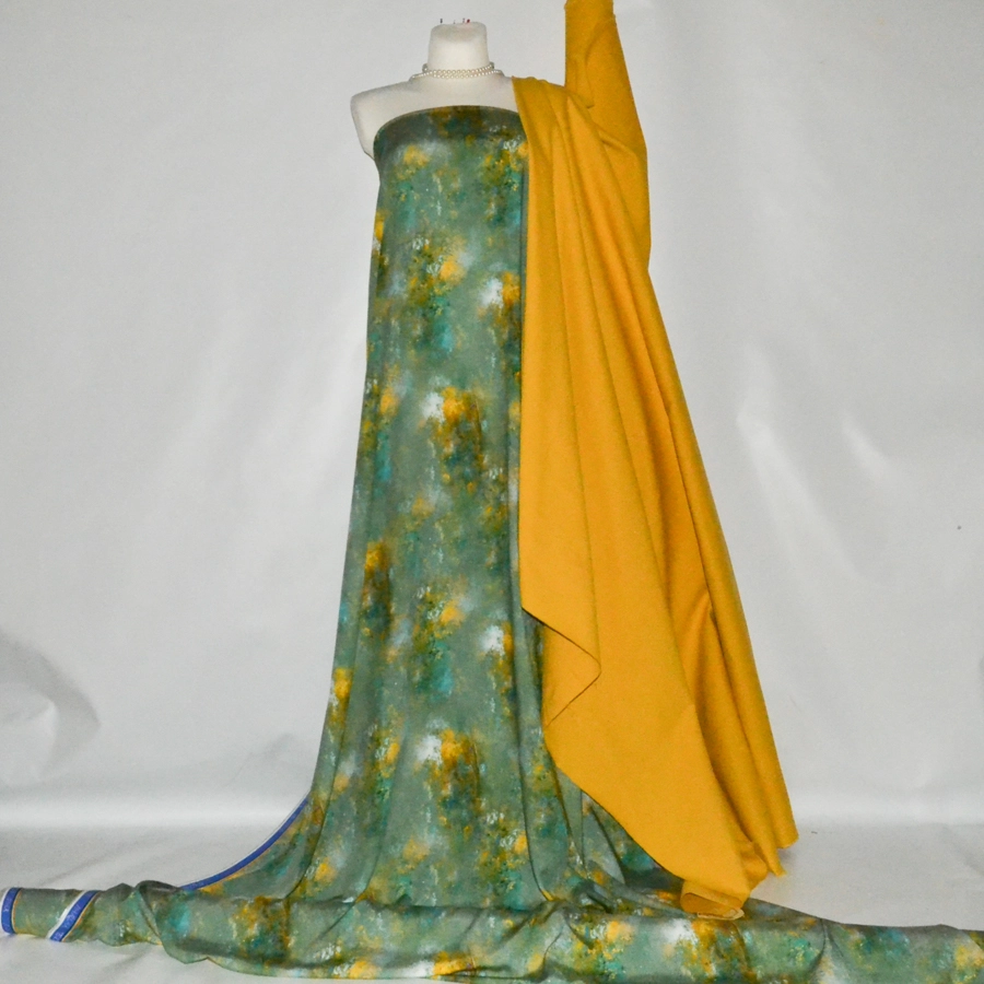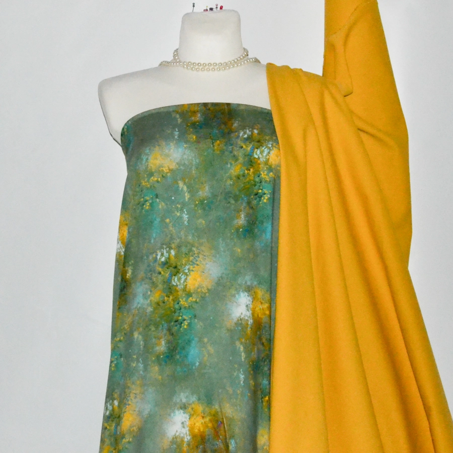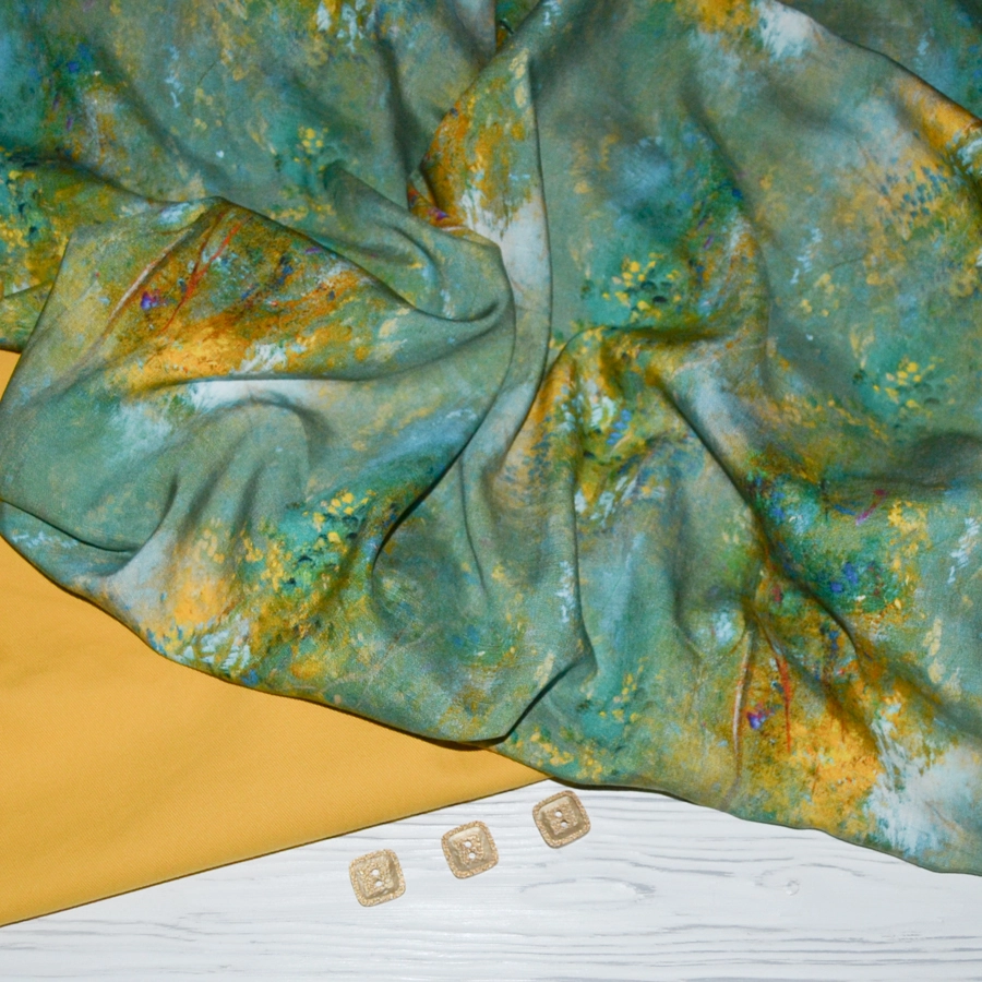 Плательно-блузочная вискозная ткань полотняного переплетения с абстрактным рисунком в зелено-желтых тонах.Крупный принт напоминает купу деревьев в золотом убранстве бабьего лета.