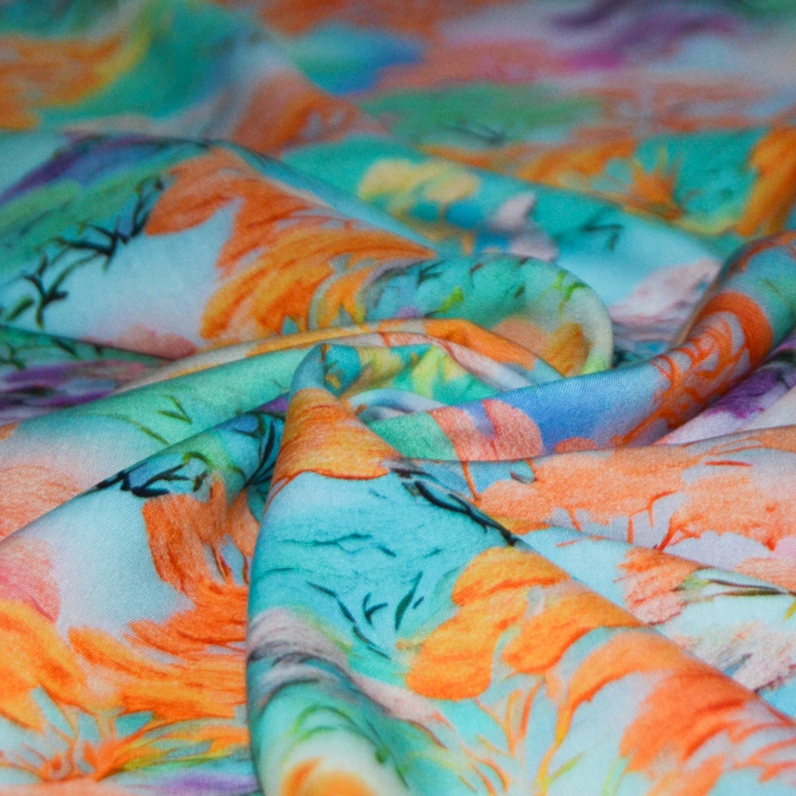 Плательно-блузочная вискозная ткань сатинового переплетения с рисунком в виде кораллово-оранжевых,темно-лиловых и темно-розовых экзотических деревьев на бирюзовом фоне.