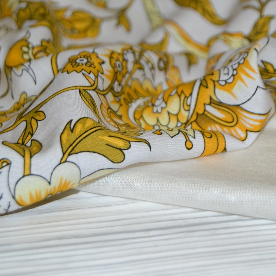 "Богатый" принт в стиле барокко в виде стилизованных цветов в желтых, горчичных оттенках на молочном фоне.