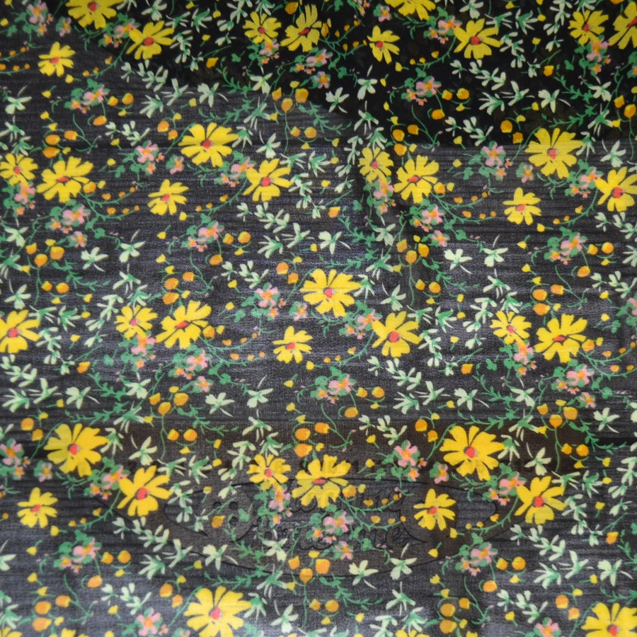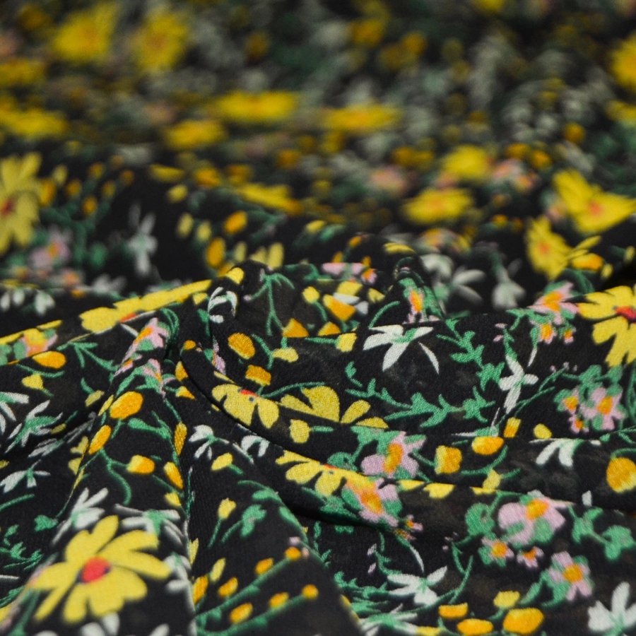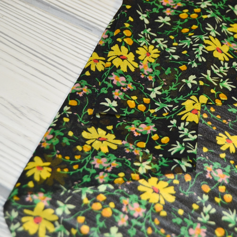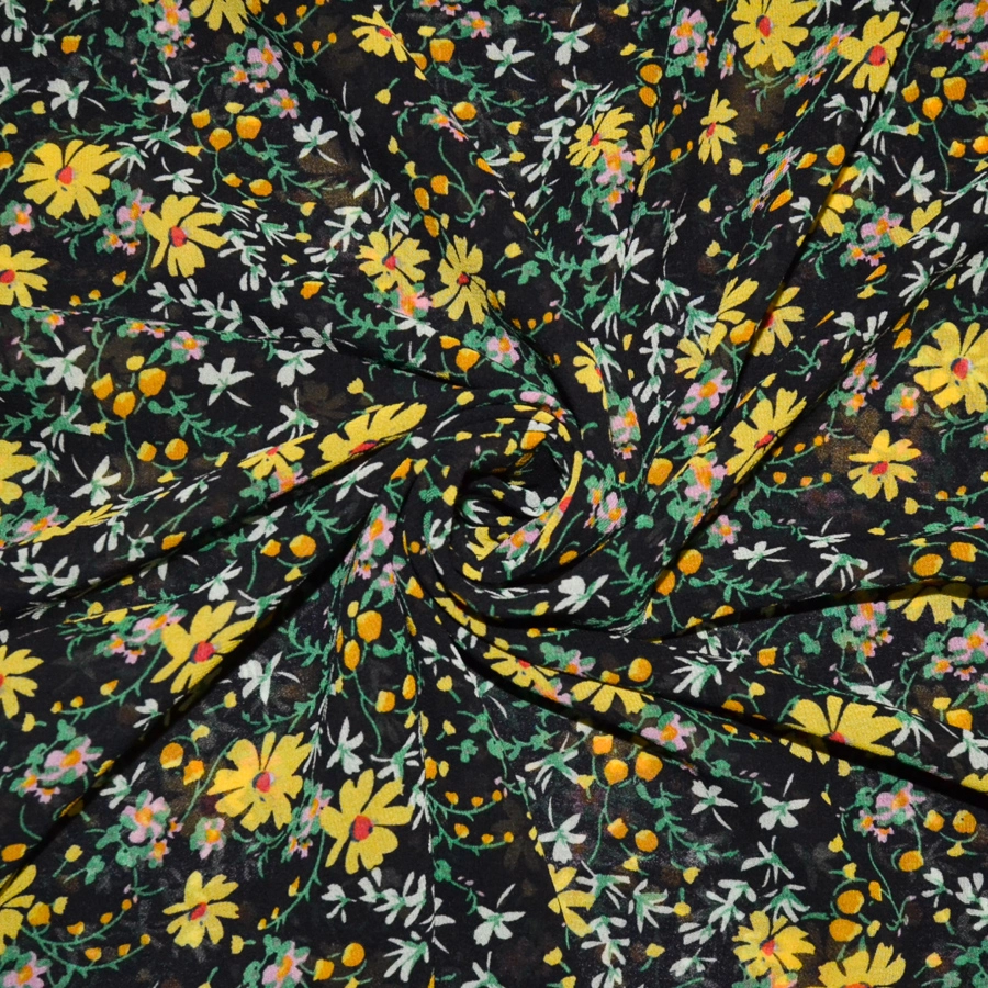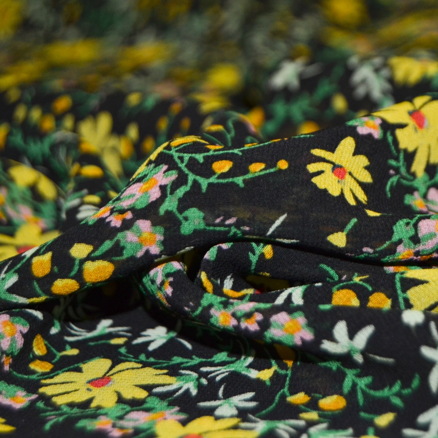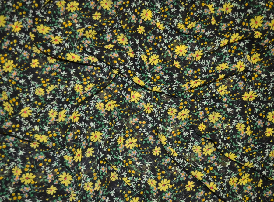 Креп-жоржет черного цвета с яркой россыпью мелких желтых цветочков.