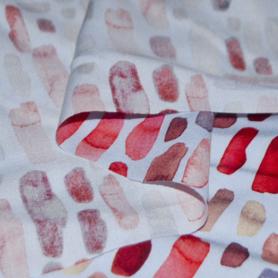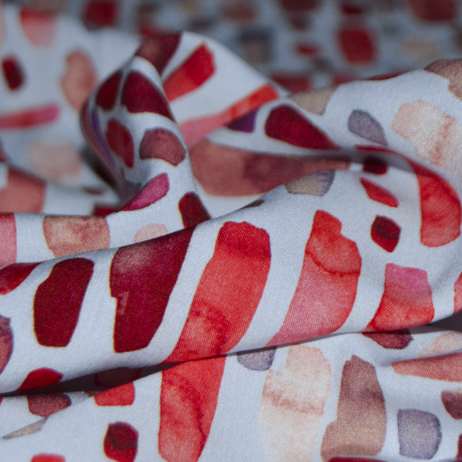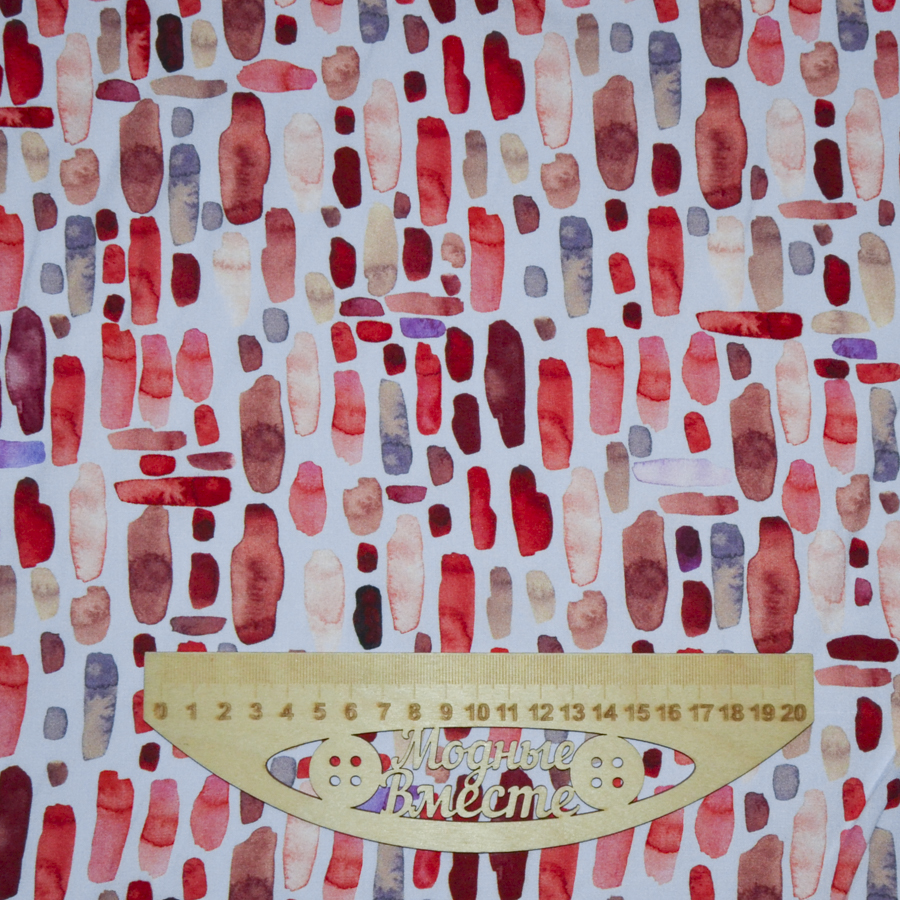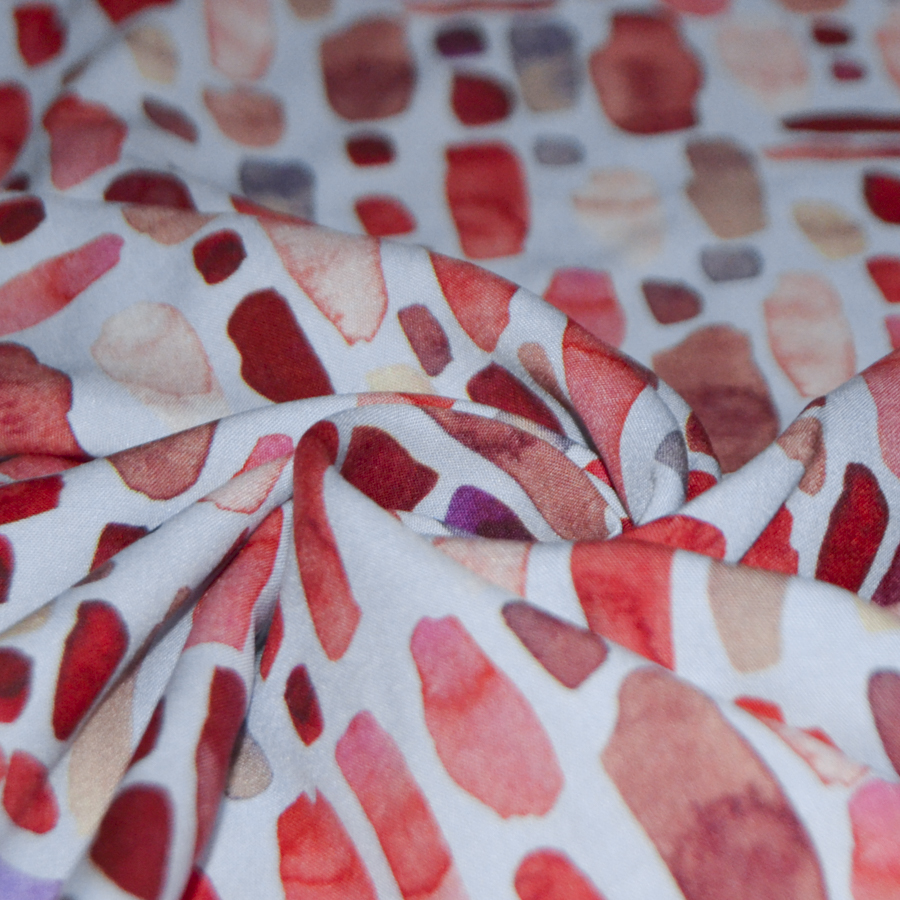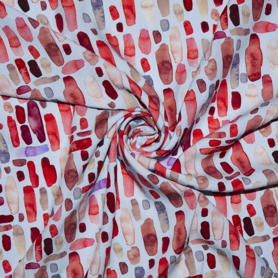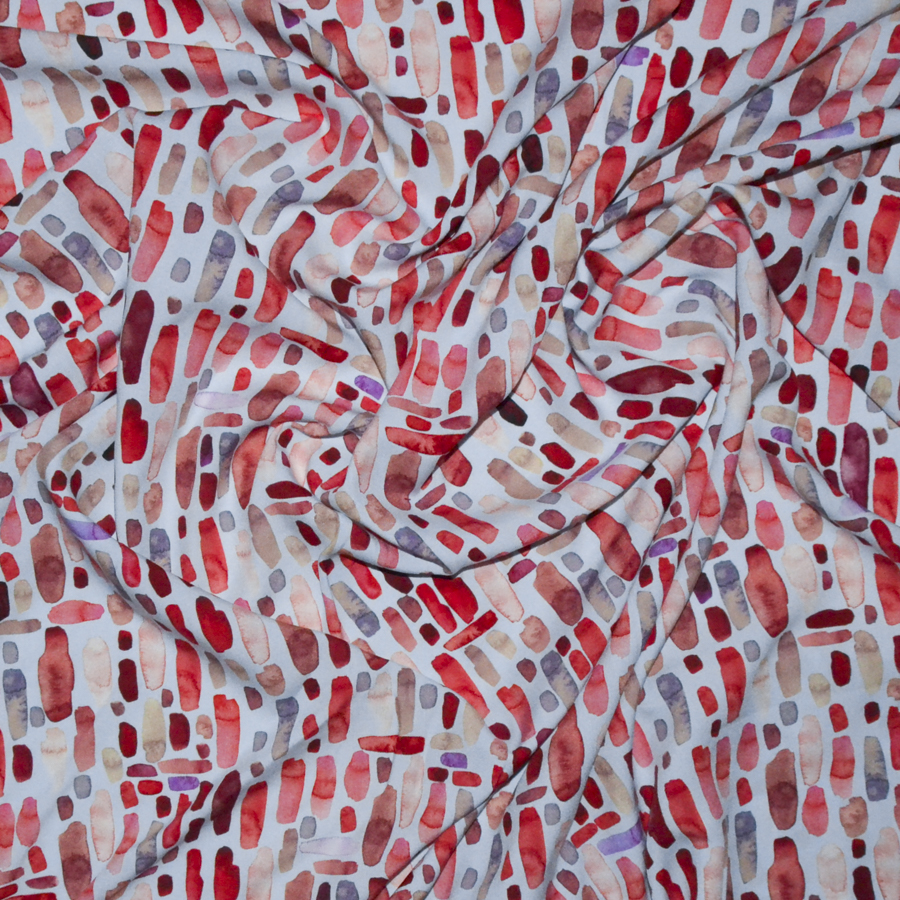 Плательно-блузочная вискозная ткань штапельного переплетения с рисунком в красно-коралловой гамме в виде "акварельных мазков" на светлом голубоватом фоне.