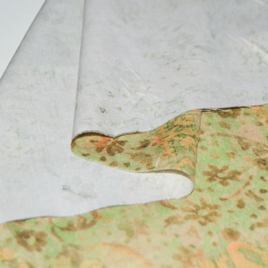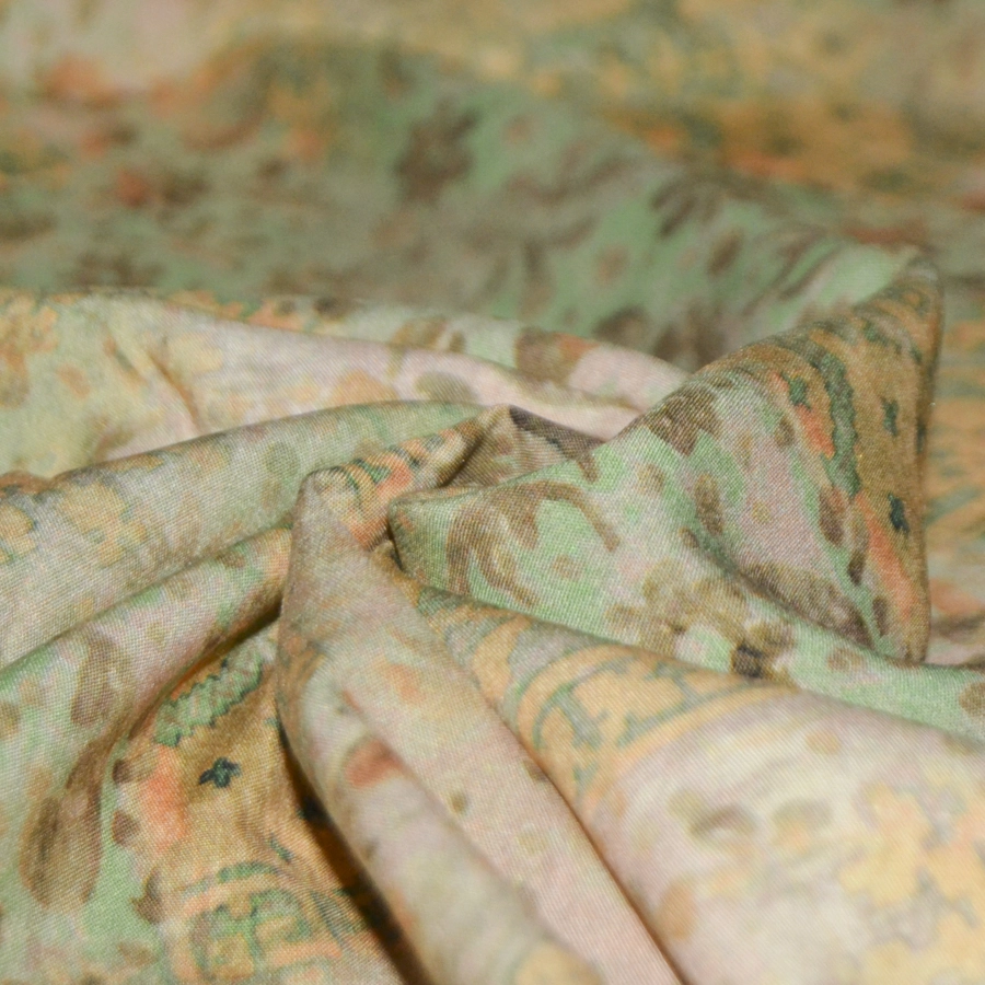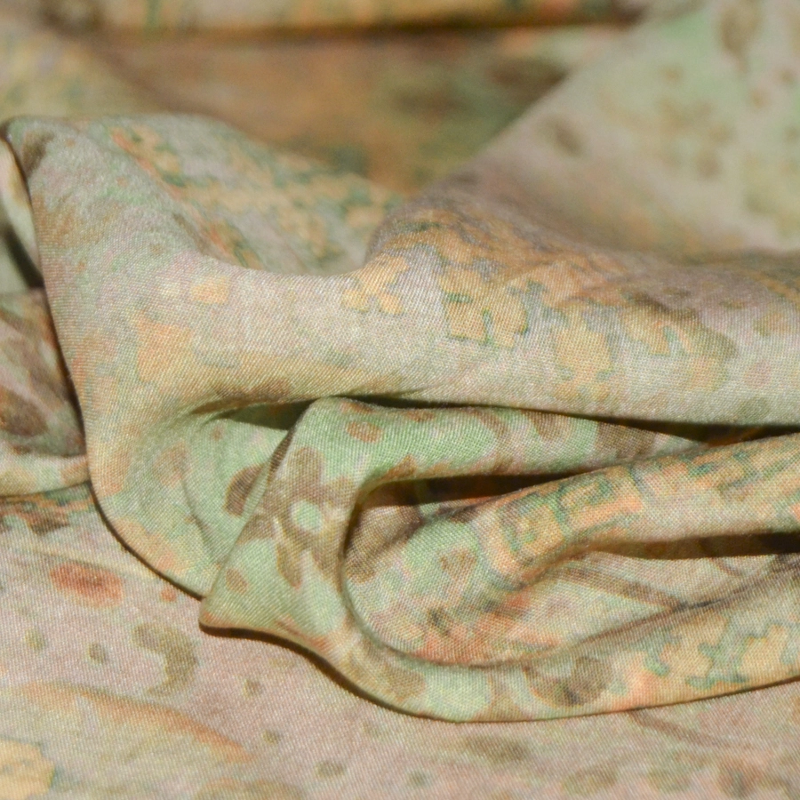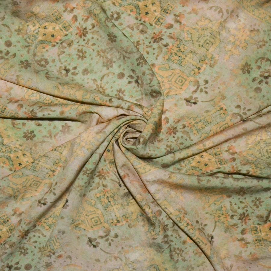 лательно-блузочная вискозная ткань штапельного переплетения с рисунком в винтажном стиле в виде мелких цветочков на бледно-зеленом фоне и геометрических фигур на золотисто-кремовом. Напоминает пэчворк,но без его геометрической точности.
