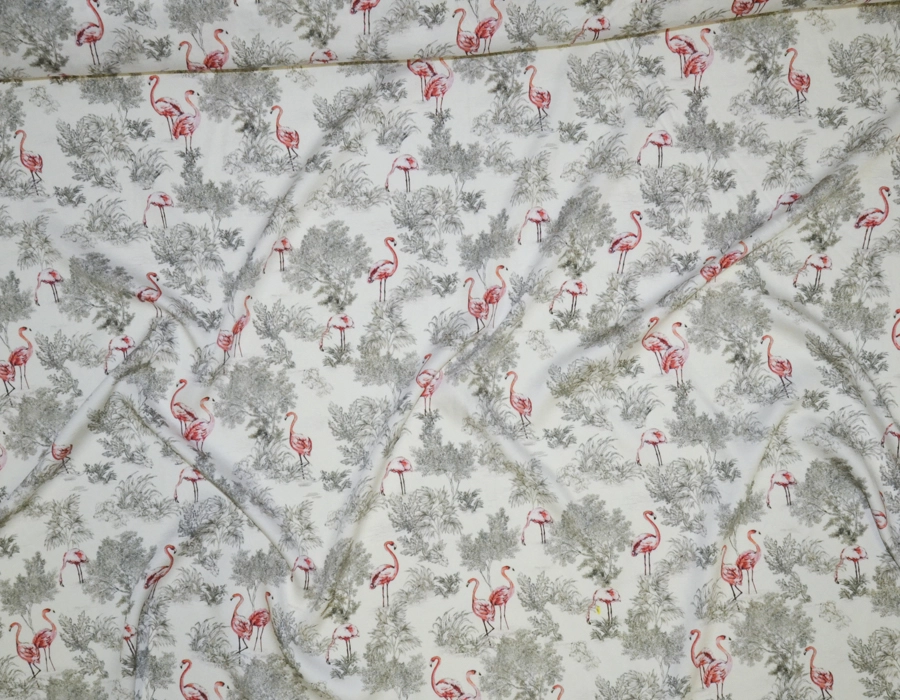 Плательно-блузочная вискозная ткань сатинового переплетения. На молочно-белом фоне изящный рисунок в стиле жуи и розовые фламинго.