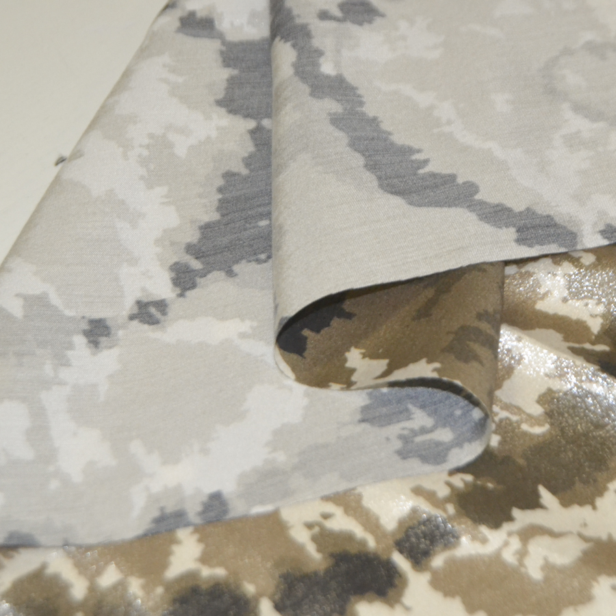 Крупный абстрактный принт, где элегантно переплетаются оттенки коричневого, бежевого и черного, придавая ткани глубину и выразительность.