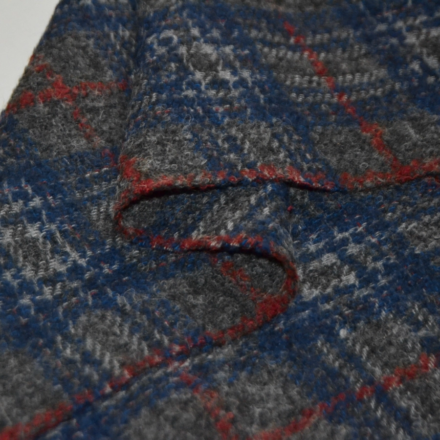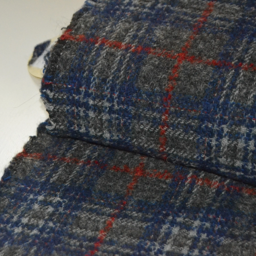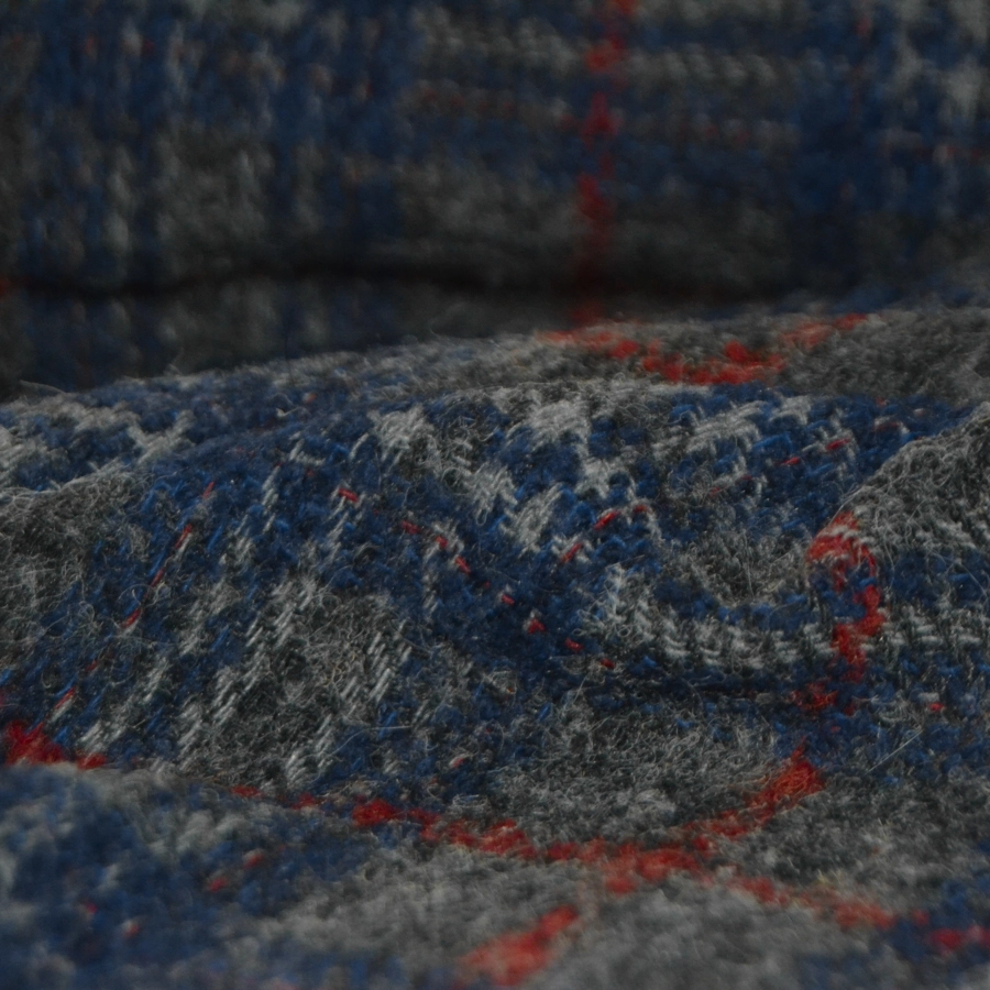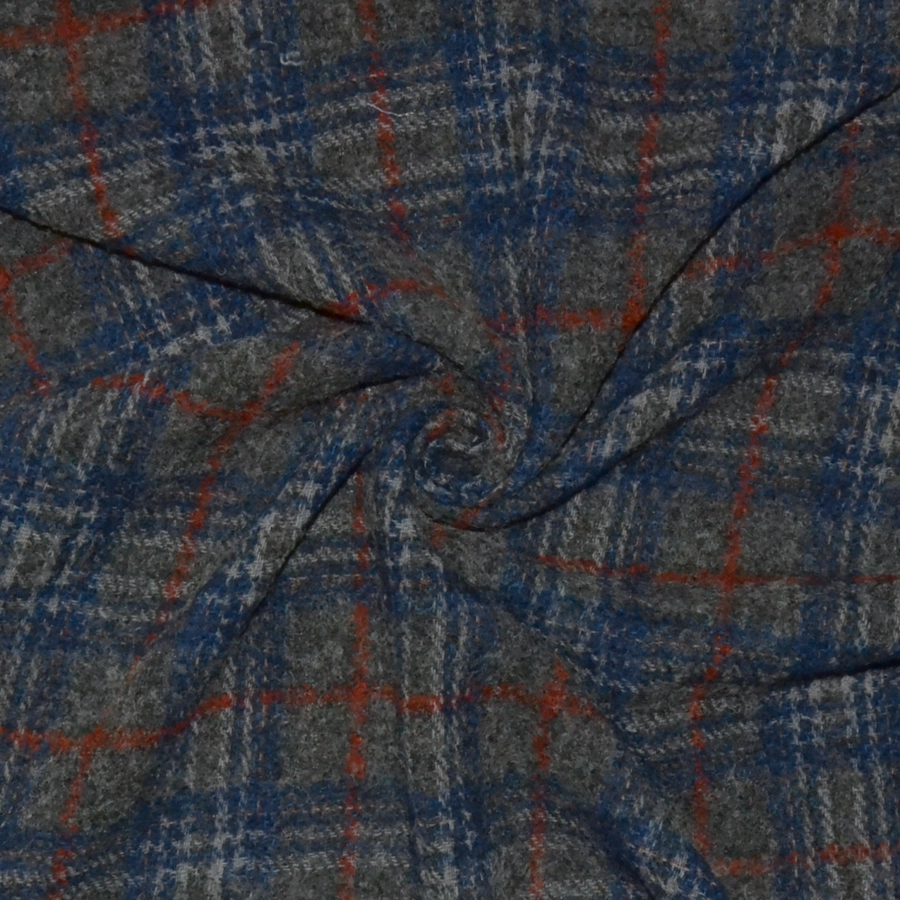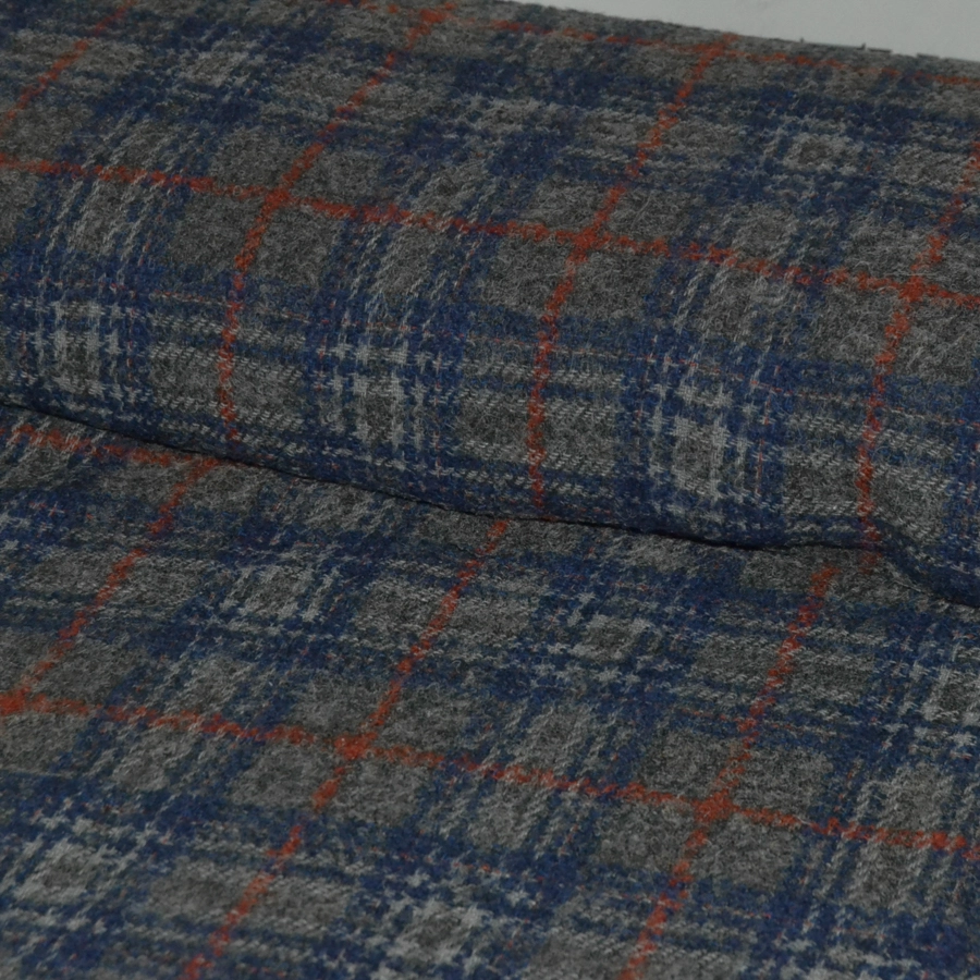 Довольно крупная клетка из синих и терракотово-красных нитей на фоне серого меланжа.
