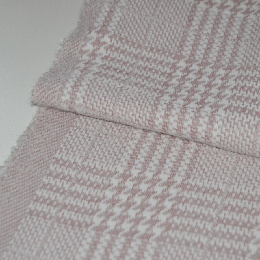 На лицевой – жаккардовый рисунок с небольшим ворсом в виде клетки гленчек пыльно-розового цвета. Изнанка гладкая однотонная молочного цвета,