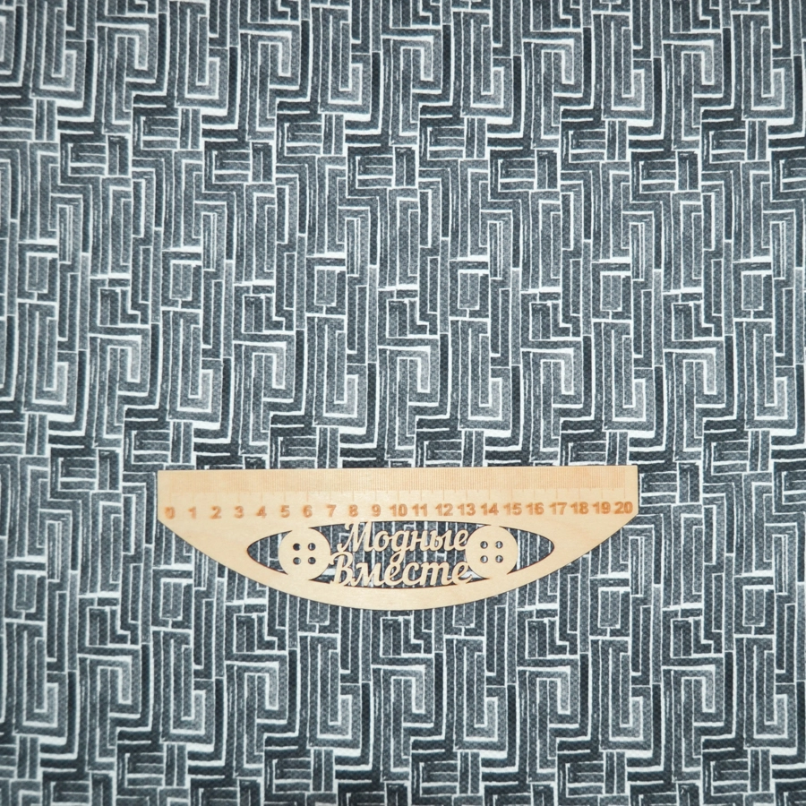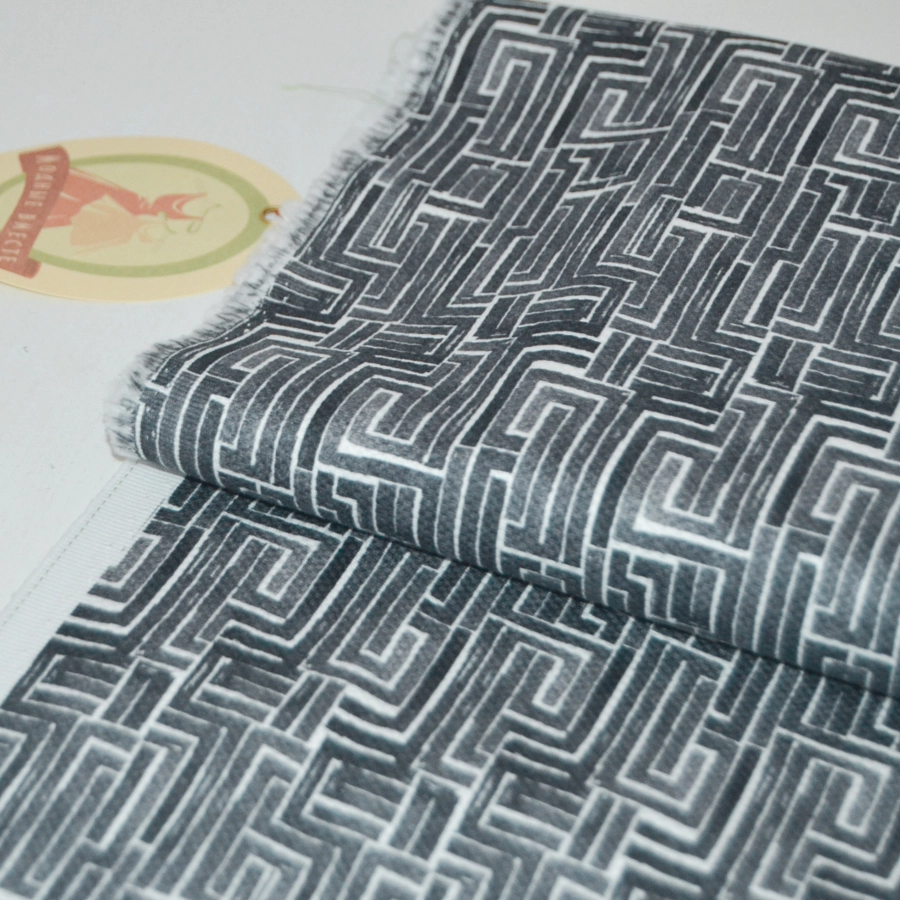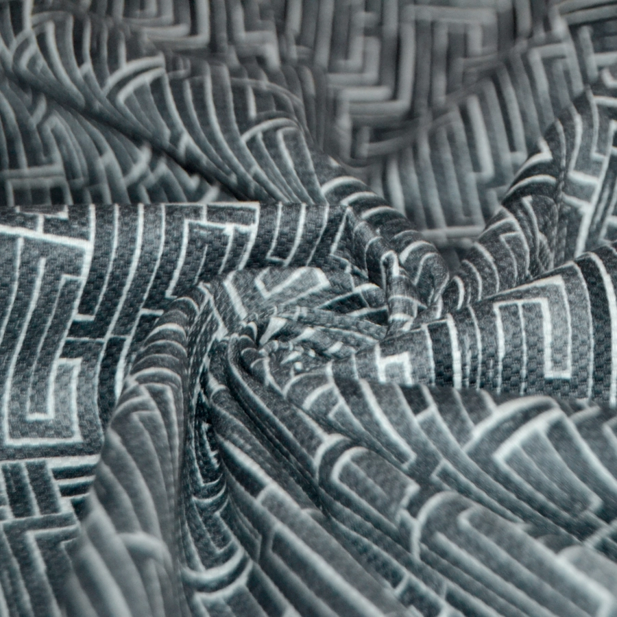 На белом фоне узор графитового цвета напоминающий лабиринты, в основе старый добрый меандр.