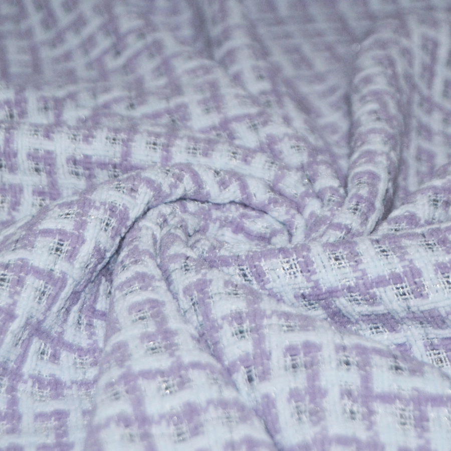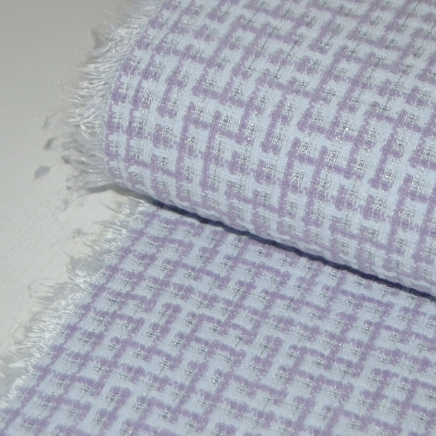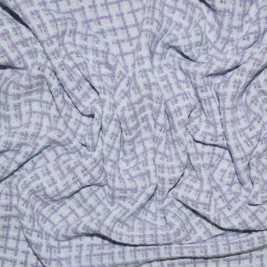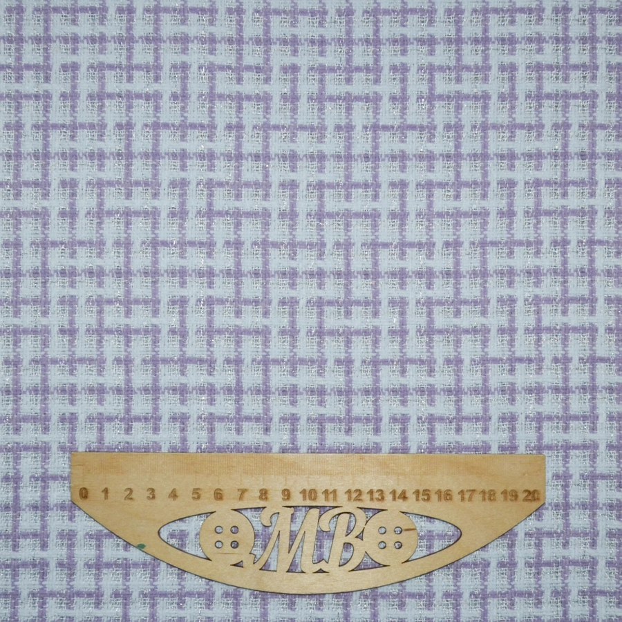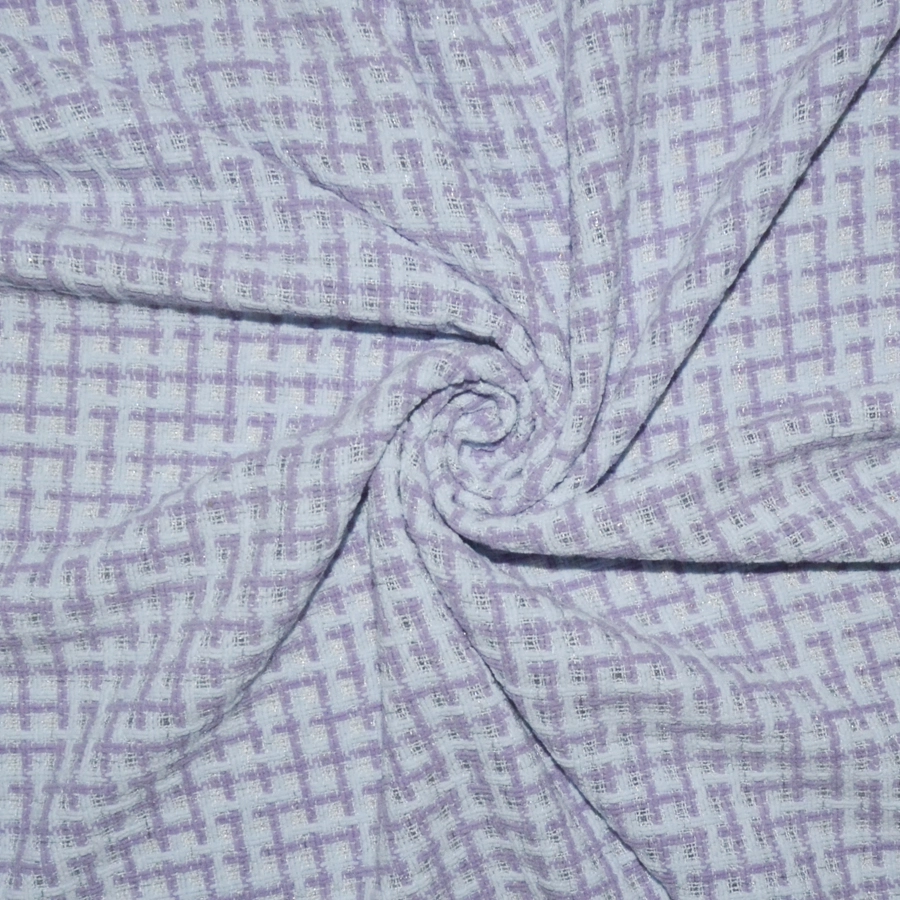Фон бледного голубоватого цвета и изящная клетка, образованная толстенькими пасмами сиреневато-розового оттенка, кручеными нитями в цвет фона цвета и небольшим вкраплением серебристой металлизированной нити.