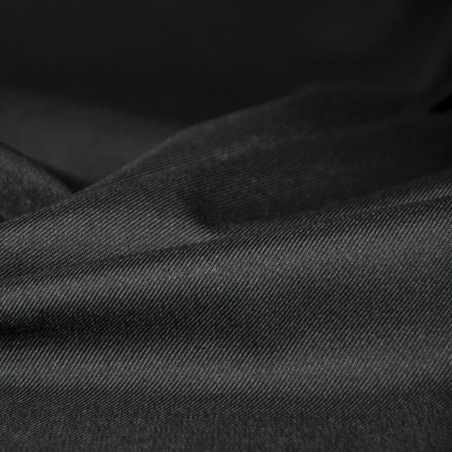 Угольно-черный цвет придает ткани универсальность, делая ее подходящей для различных стилей и образов. На поверхности присутствует тонкий диагональный рубчик, добавляющий ткани текстуру и визуальный интерес. Этот деликатный узор не перегружает внешний вид изделия, а лишь подчеркивает его изысканность.