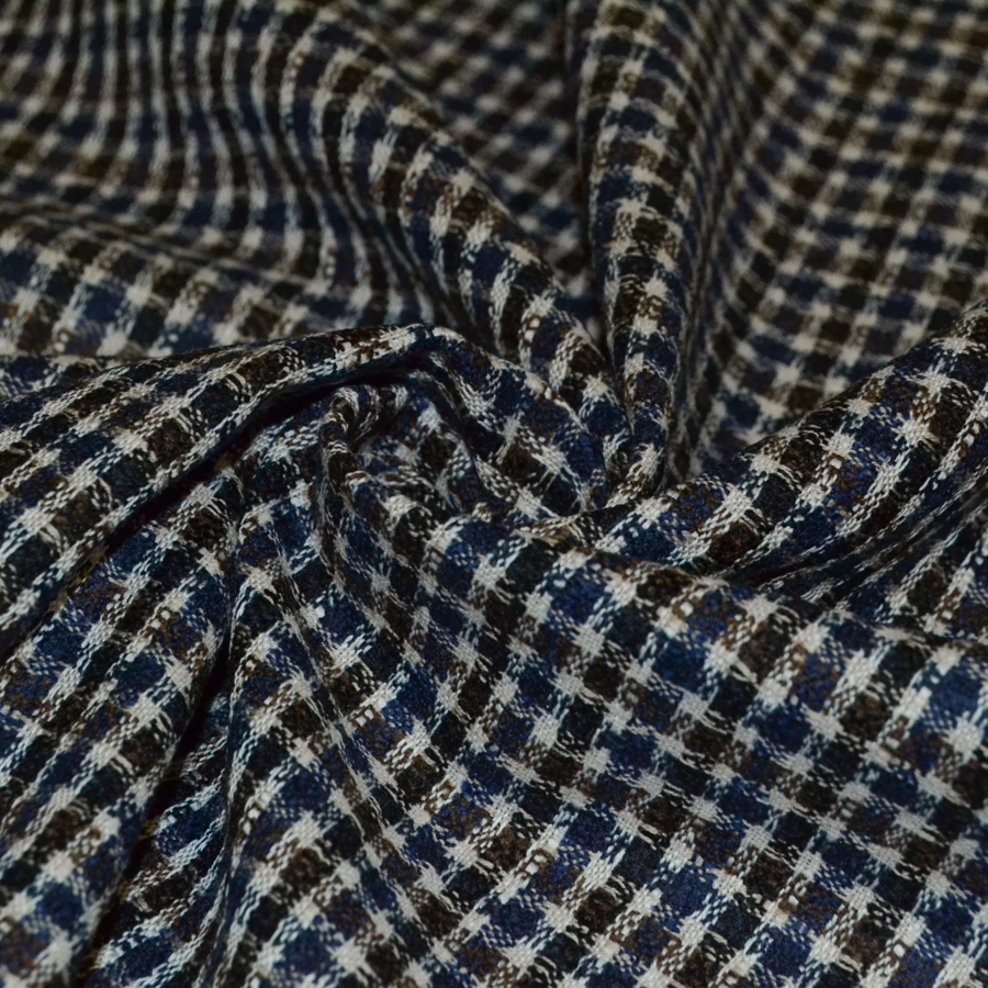 Переплетение нитей синего, молочного и коричневого цвета образуют мелкую клеточку.