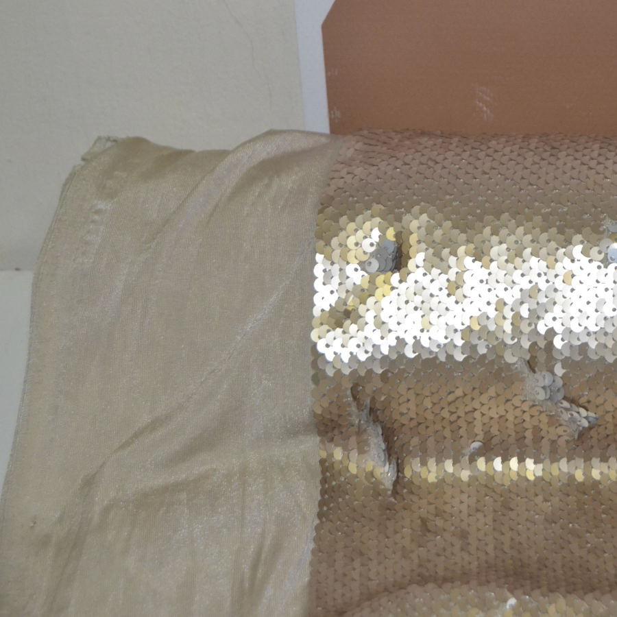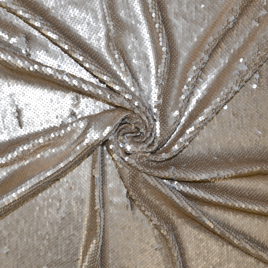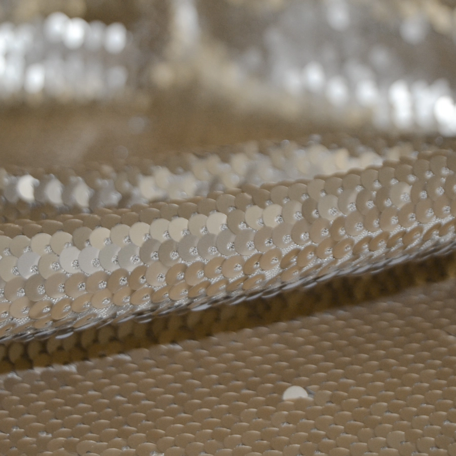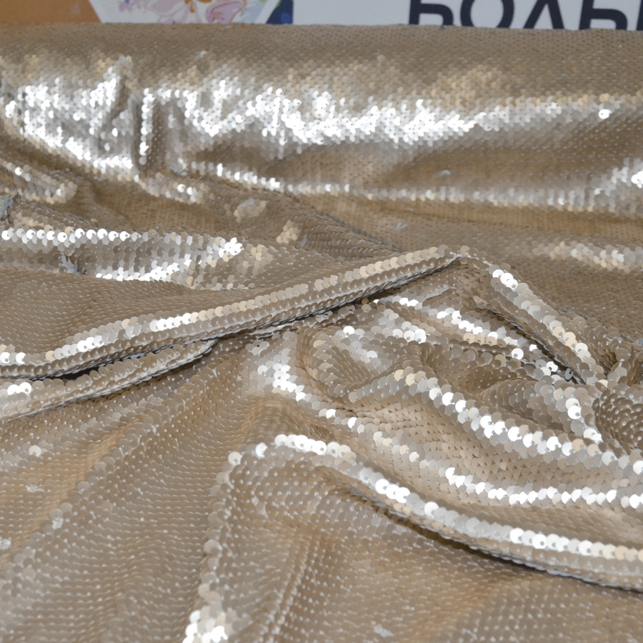 Матовые пайетки бежевого цвета, словно мерцающая россыпь песка, украшают тонкую трикотажную основу.