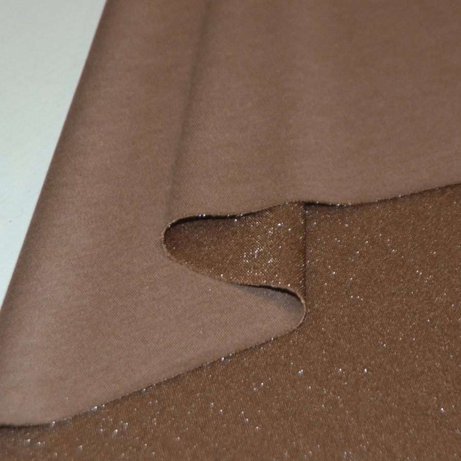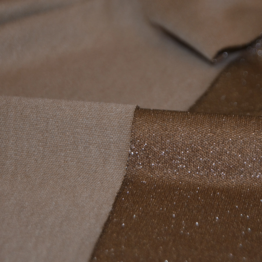 Лицевая сторона с деликатным серебристым блеском. Изнаночная - матовая, шелковистая. Тактильно люрекс совершенно не ощущается, даже с лицевой стороны.