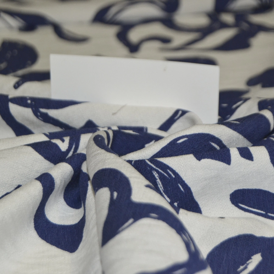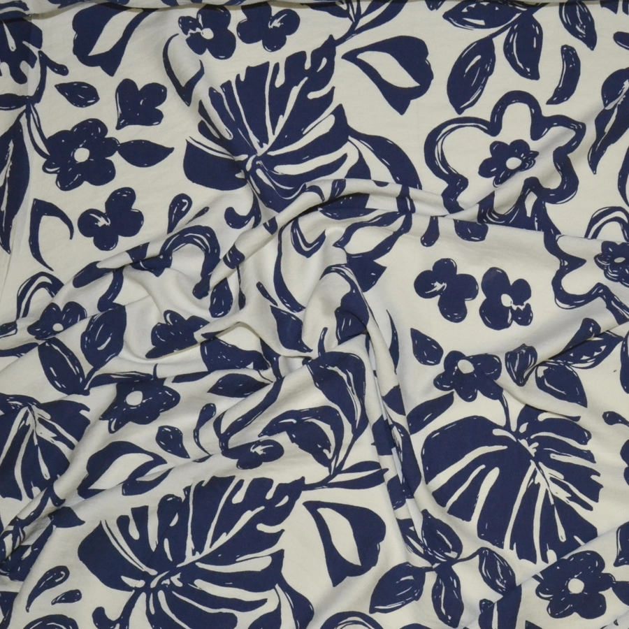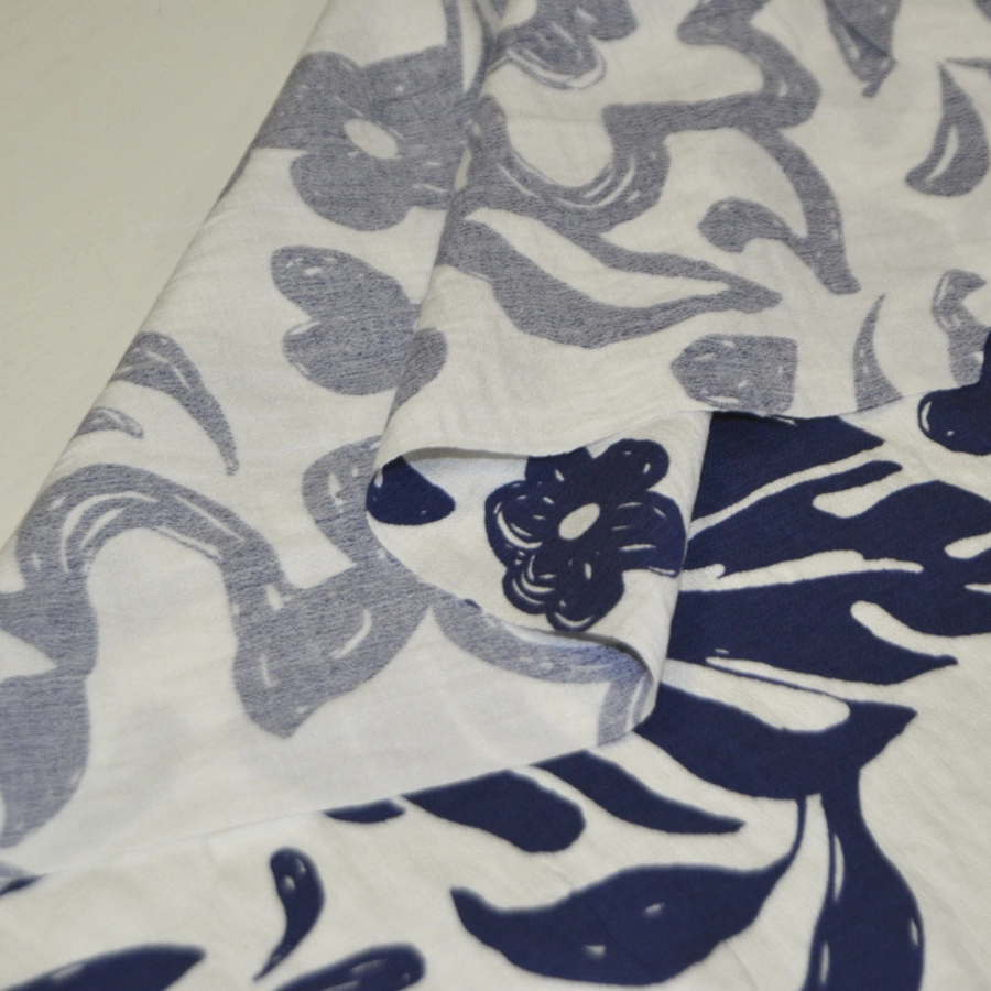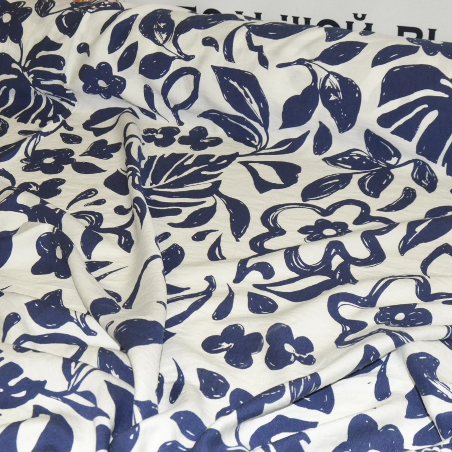Принт в виде стилизованных крупных абстрактных листьев и цветов темно-синего цвета на белом фоне.