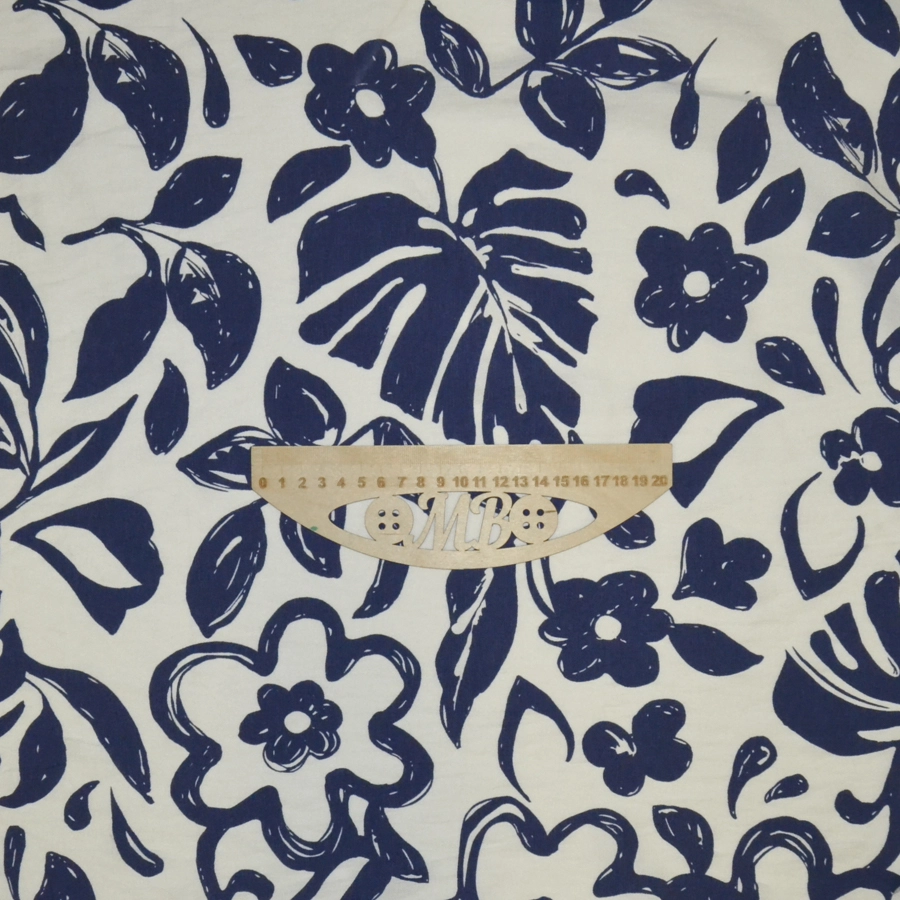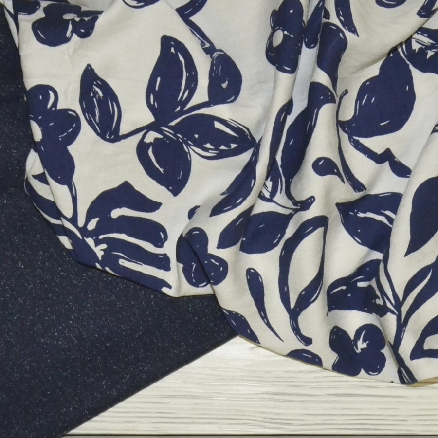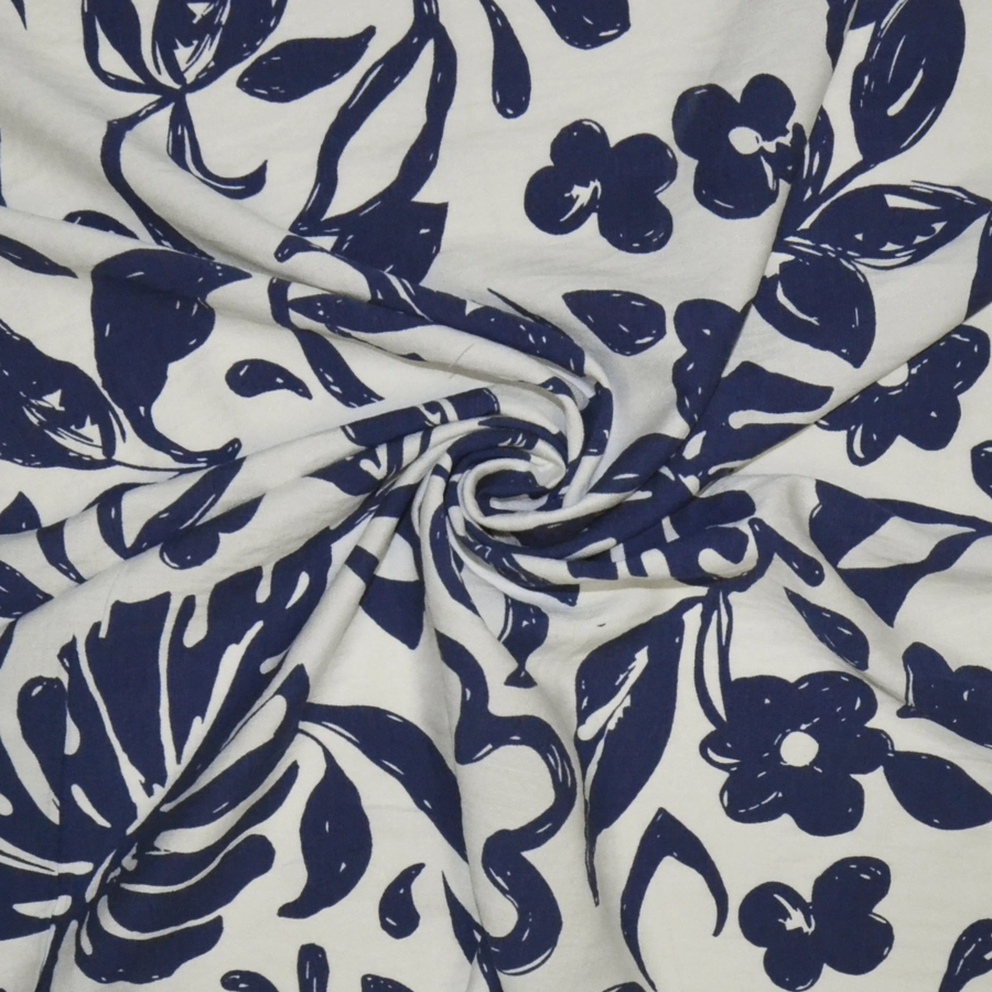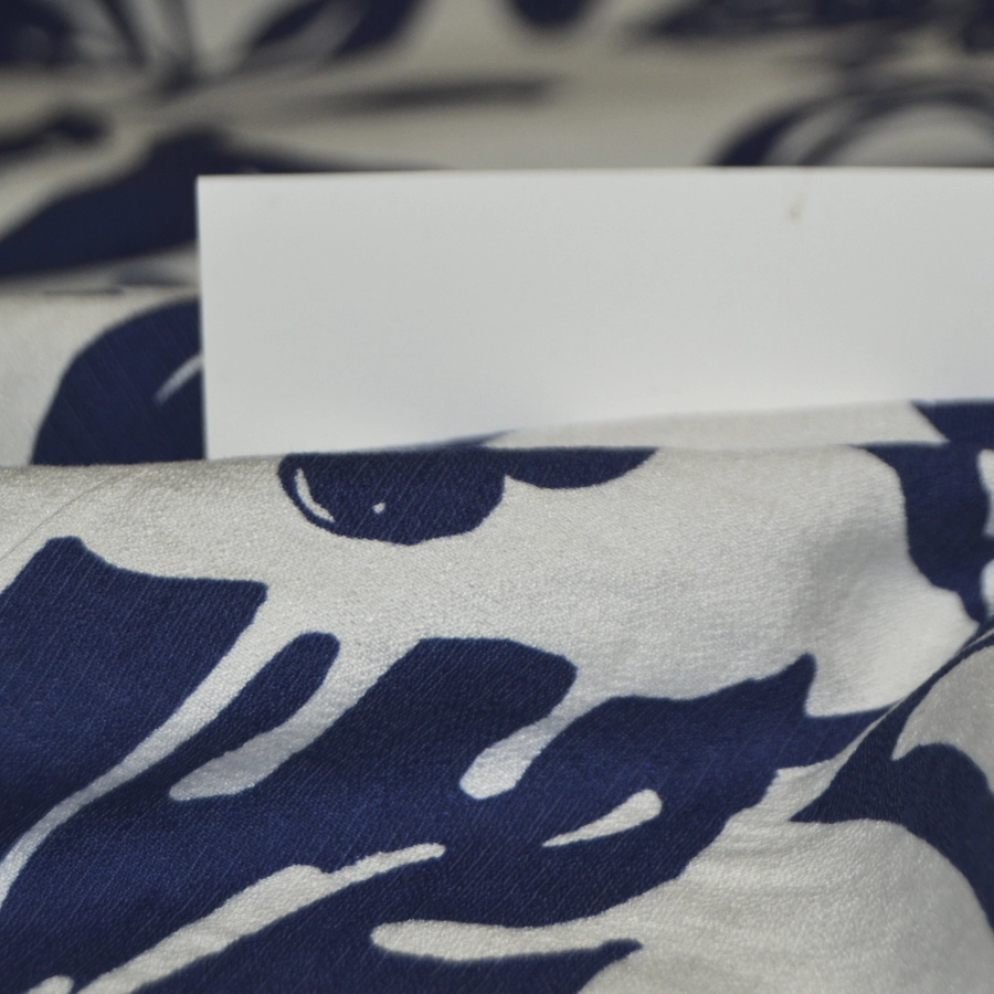 Принт в виде стилизованных крупных абстрактных листьев и цветов темно-синего цвета на белом фоне.