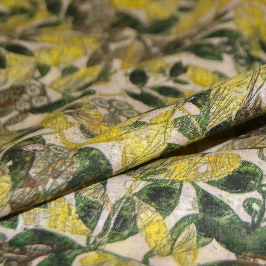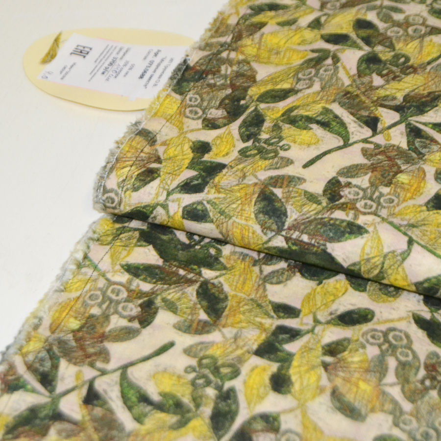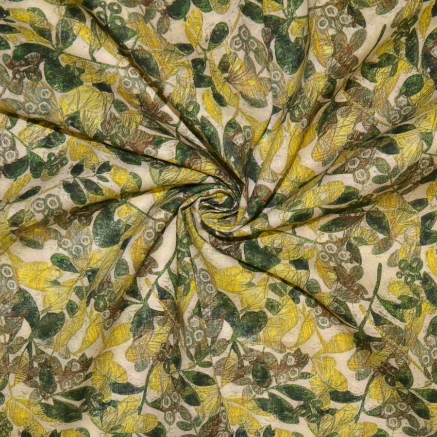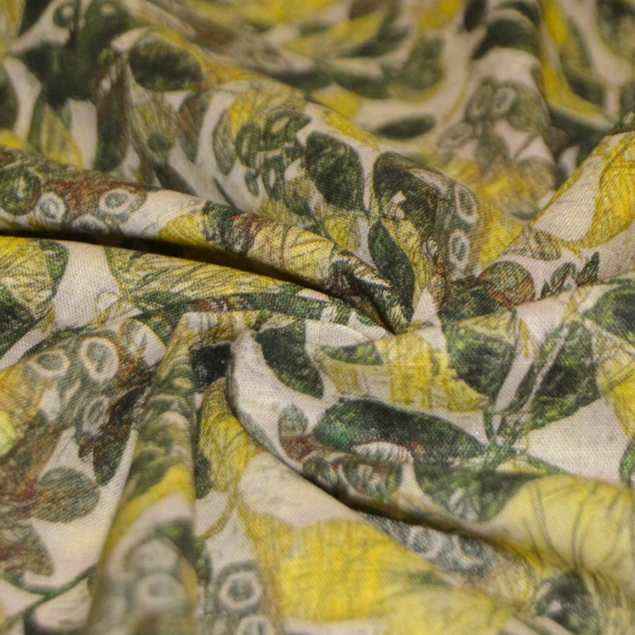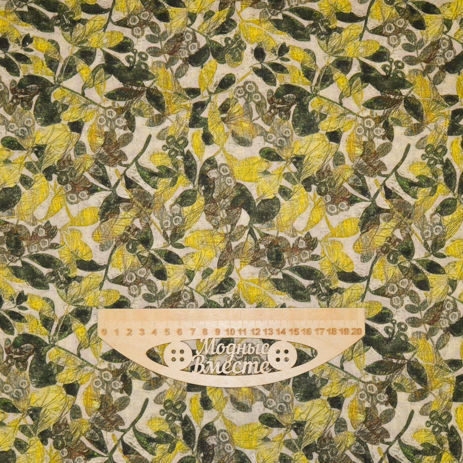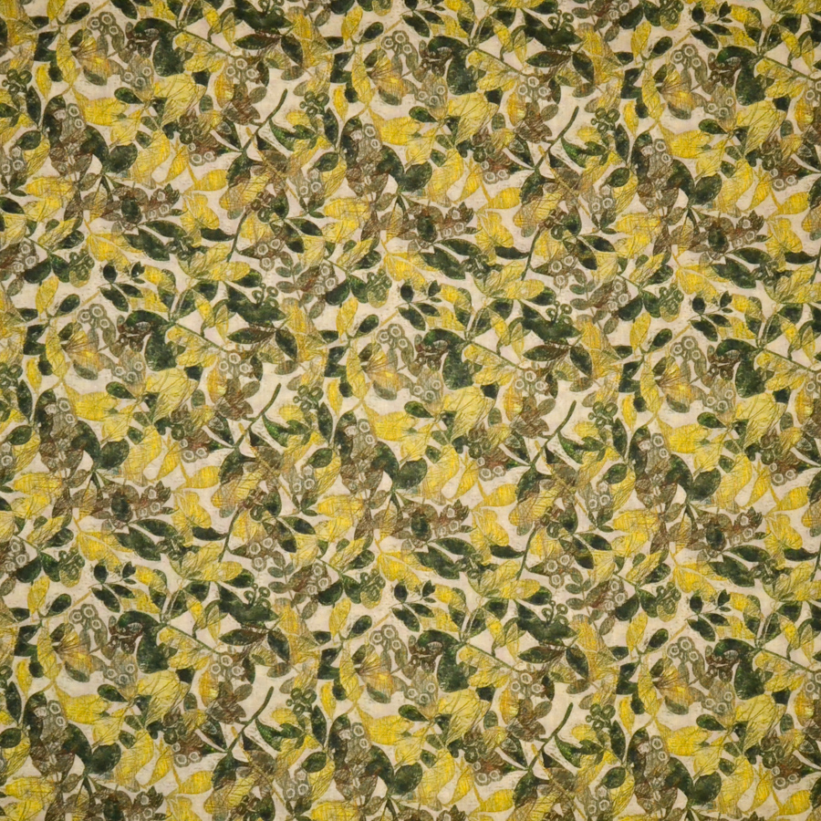На натурально-льняном цвете фона россыпь некрупных веточек и листочков с ягодками в горчичном и серо-зеленом оттенках.