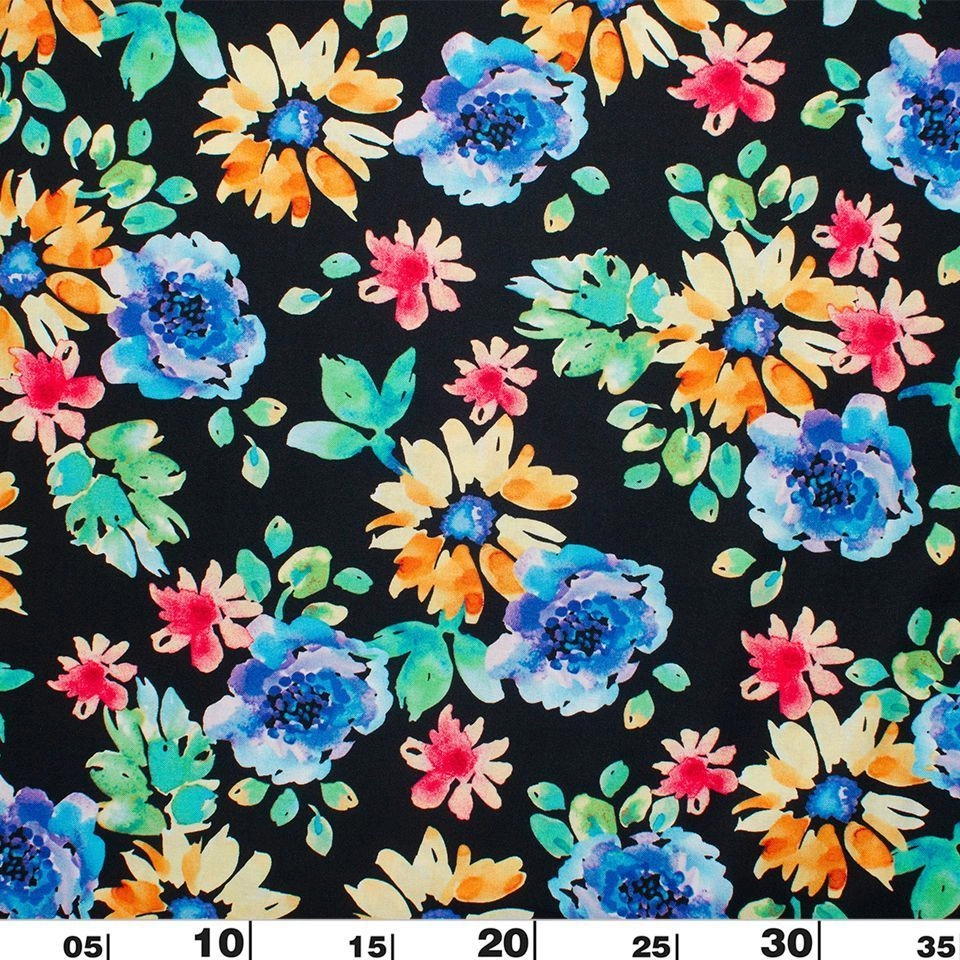 Яркие краски цветочного узора на этой ткани создают прекрасное отпускное настроение. Цветущие растения наполнили летний сад незабываемым ароматом, а великолепный американский хлопок с модным крупнным цветочным принтом сделал процесс шитья приятым и быстрым, а результат - восхитительным. Для платьев, юбок, сарафанов - выбирайте любой фасон, ткань одинаково хорошо будет смотреться в любом изделии Яркие цветы на черном фоне.