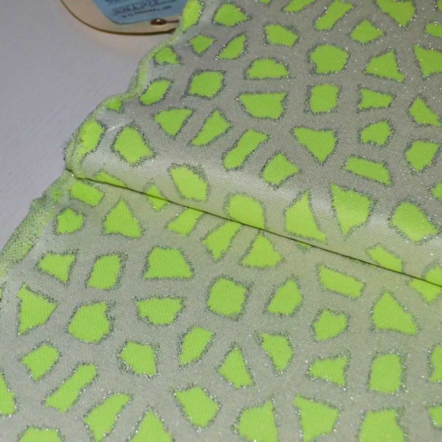 Вискозный трикотаж тонкий джерси с жаккардовым узором в виде пятен неонового лаймового цвета на светло-салатовом фоне.