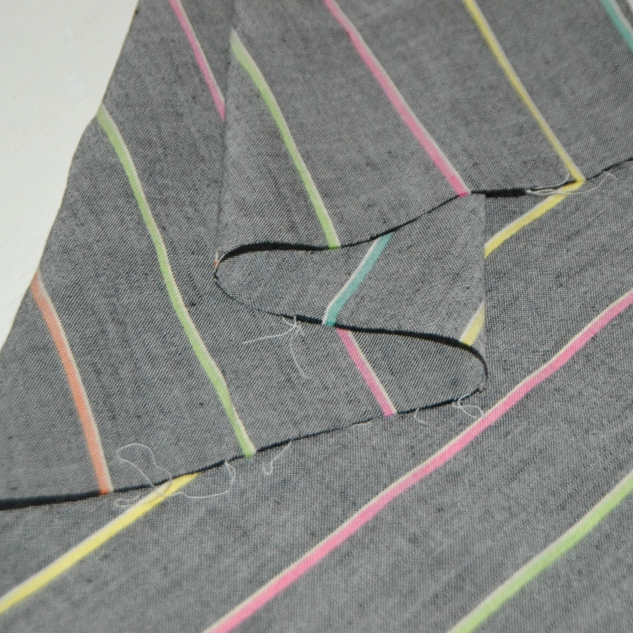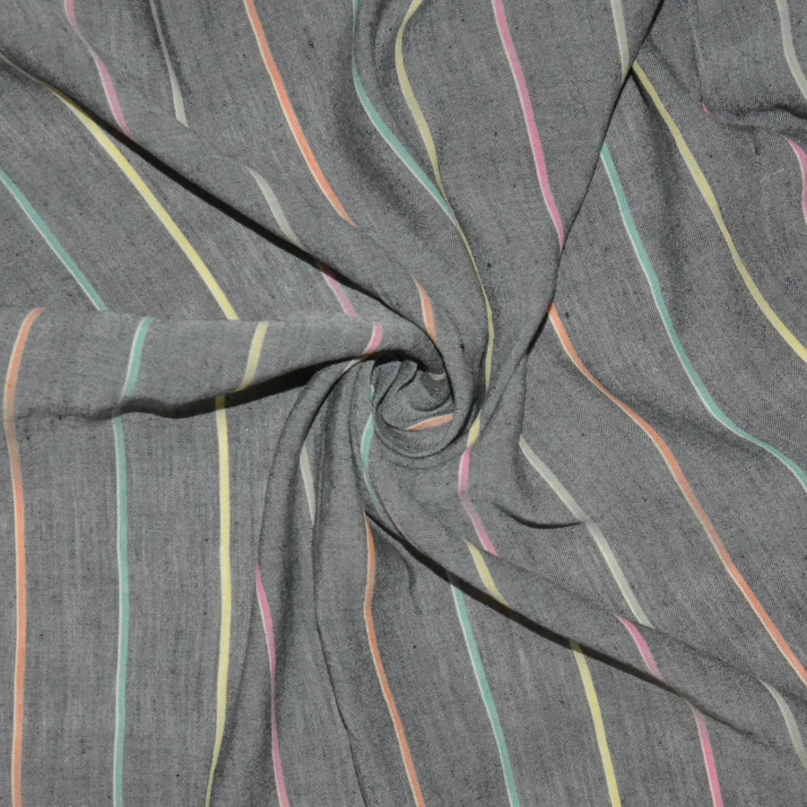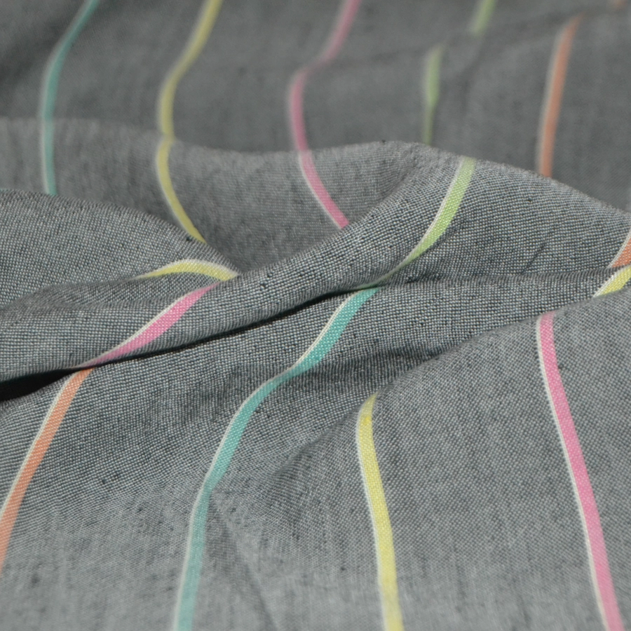 Плательно-блузочный лен в вертикальную тонкую полоску разных цветов на спокойном сером фоне.