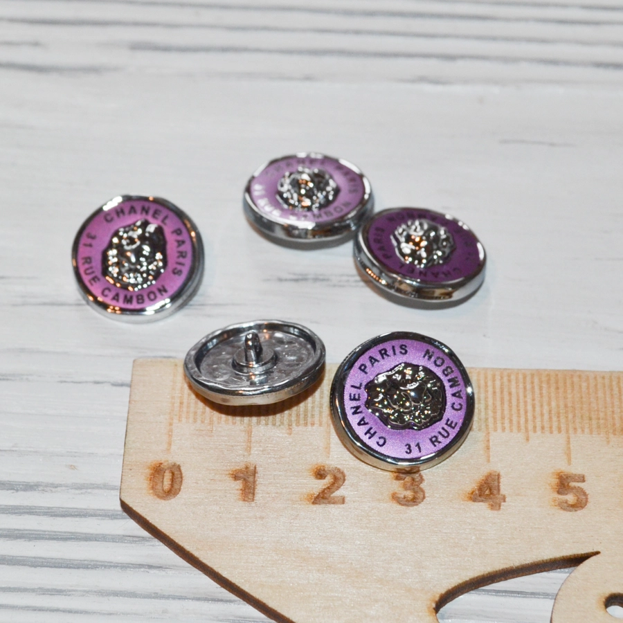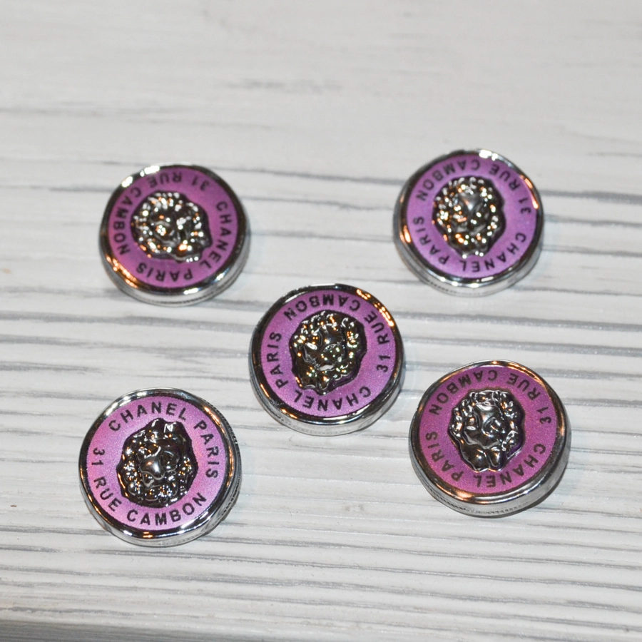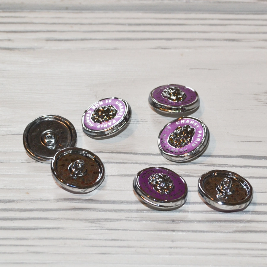 Костюмные металлические пуговицы с надписью Шанель и яркой сиренево-розовой эмалью.
