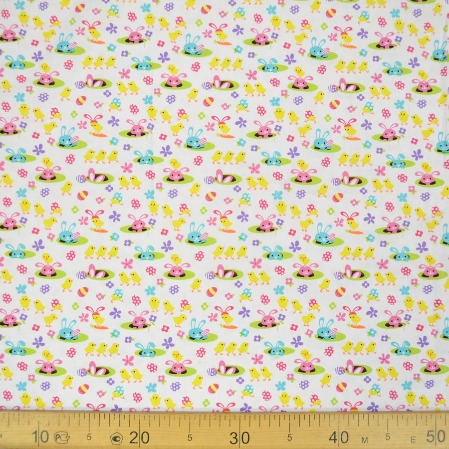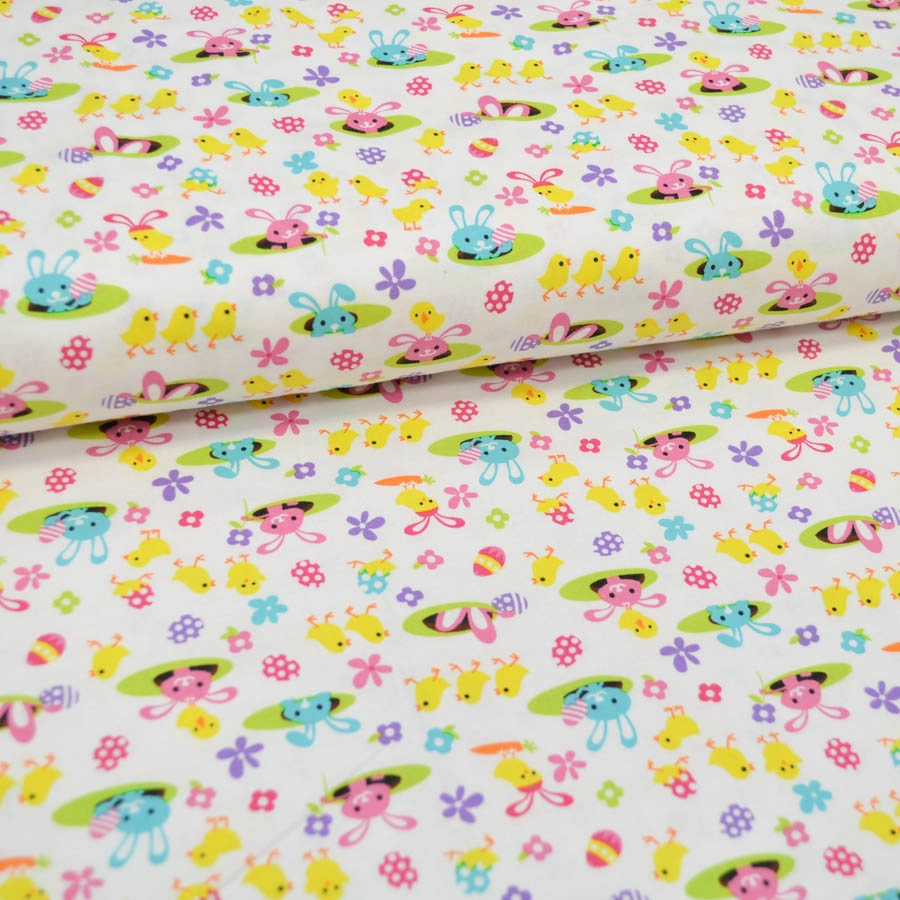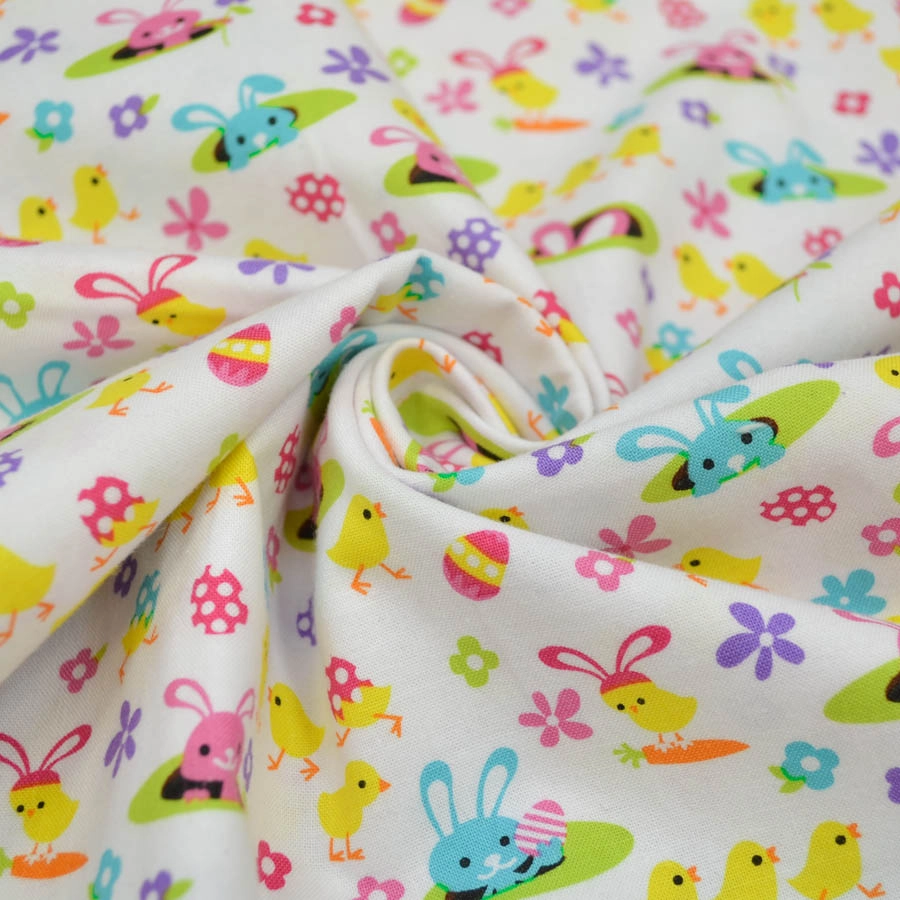 Веселые розовые, бирюзовые зайчишки и желтые цыплята на белом фоне.