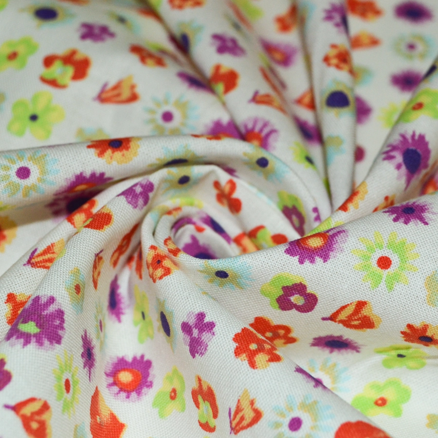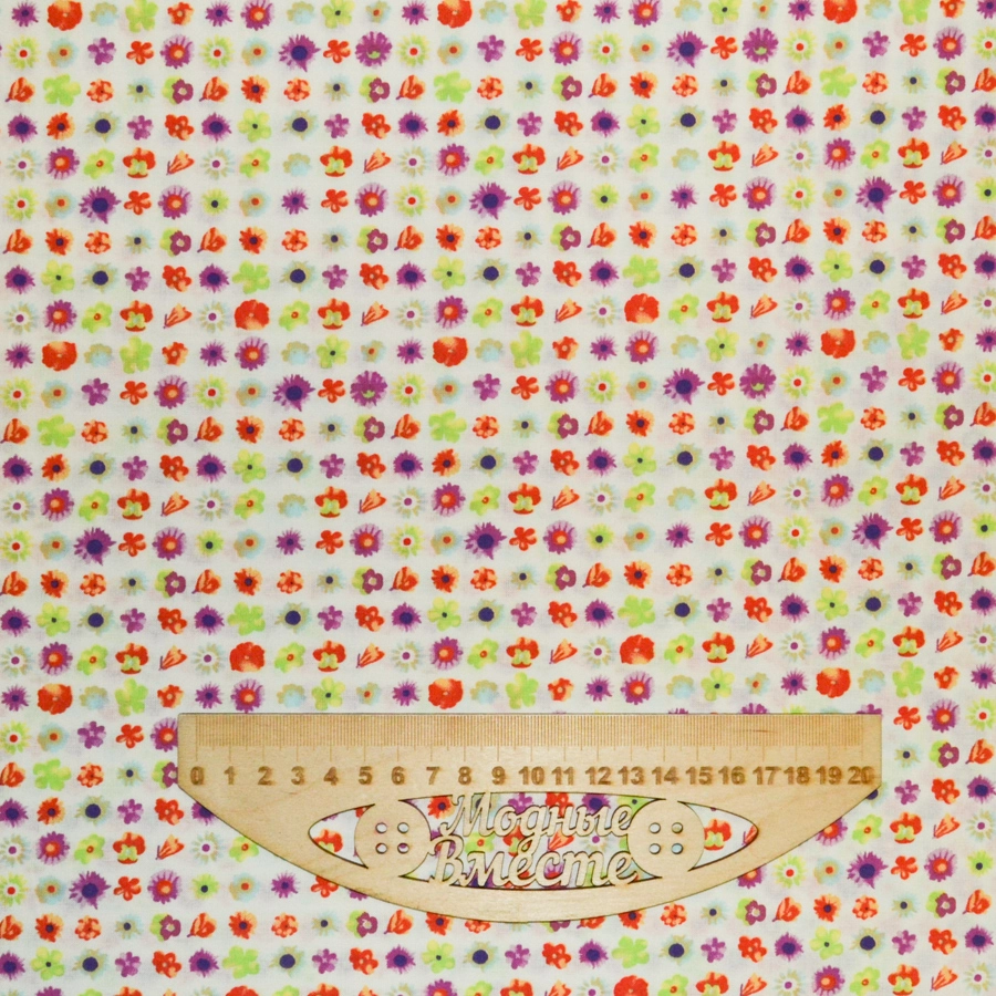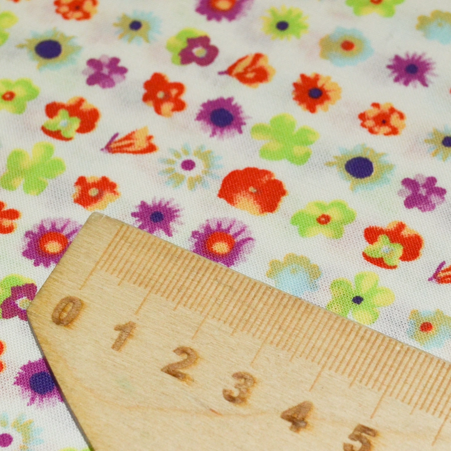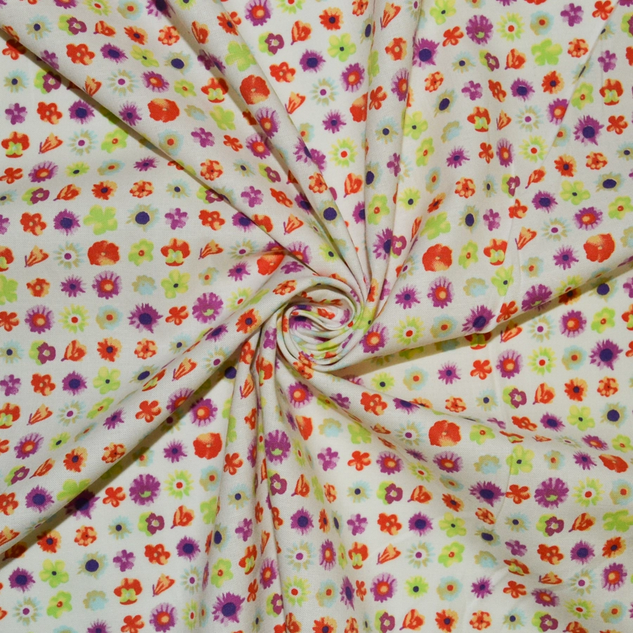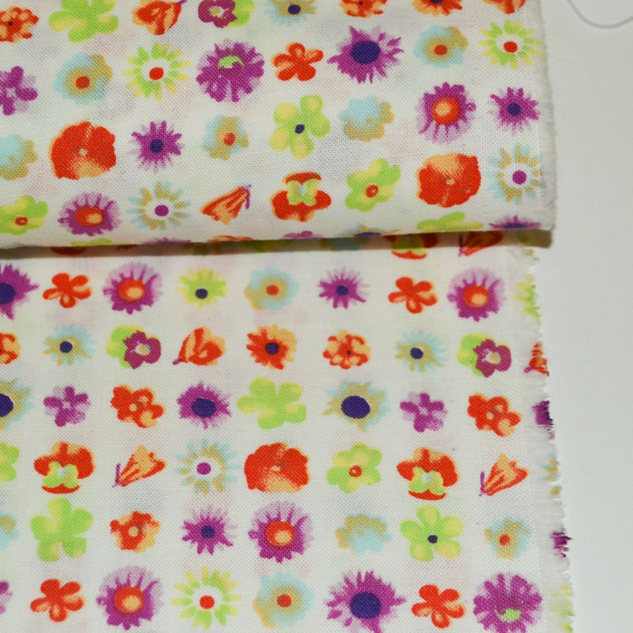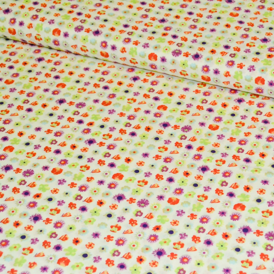 Основа молочного цвета, мелкие разноцветные цветы по всему полотну.
