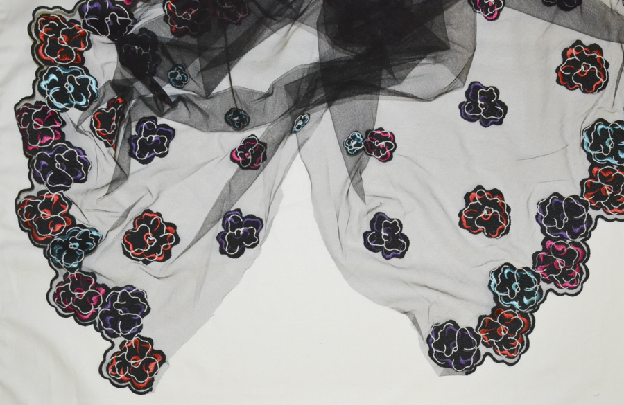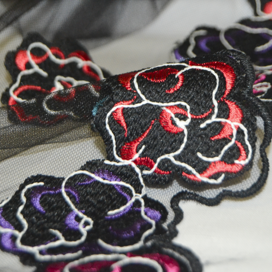 - Структура: сетка в мелкую ячейку, розочки нашиты в виде аппликации.