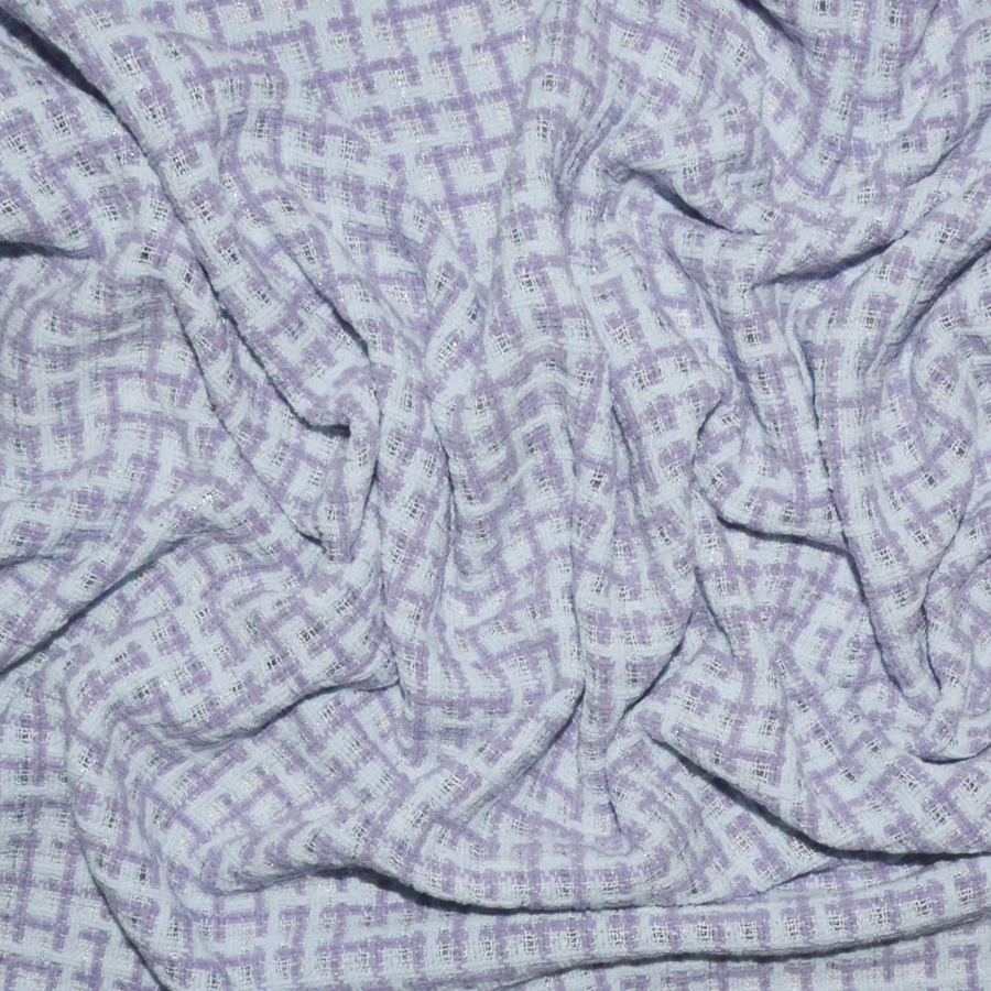 Фон бледного голубоватого цвета и изящная клетка, образованная толстенькими пасмами сиреневато-розового оттенка, кручеными нитями в цвет фона цвета и небольшим вкраплением серебристой металлизированной нити.