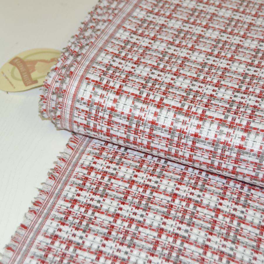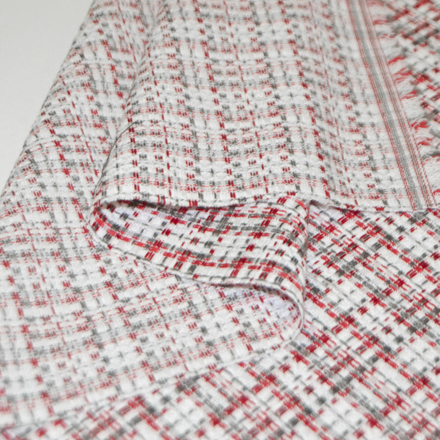 Поверхность ткани рельефная из-за разной толщины нитей, есть легки просвет, изделия лучше шить с подкладкой.Бахрома выпускается.