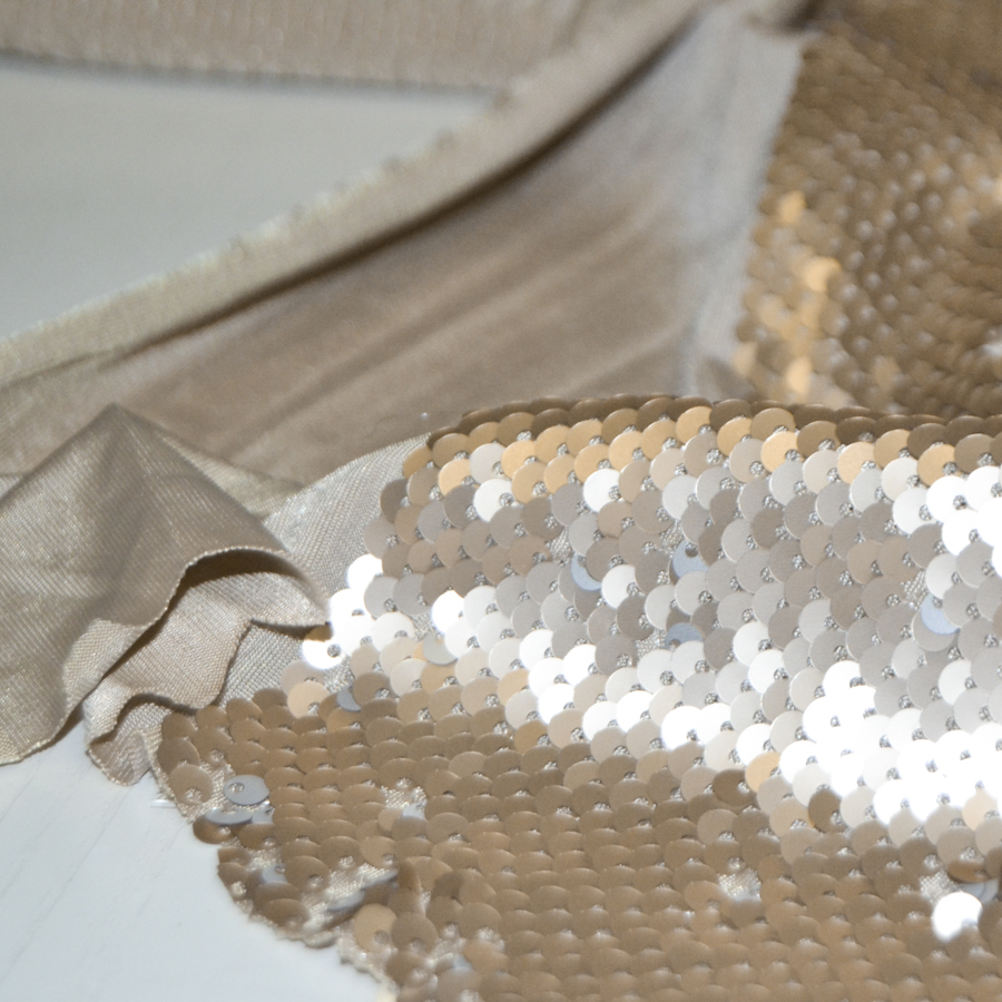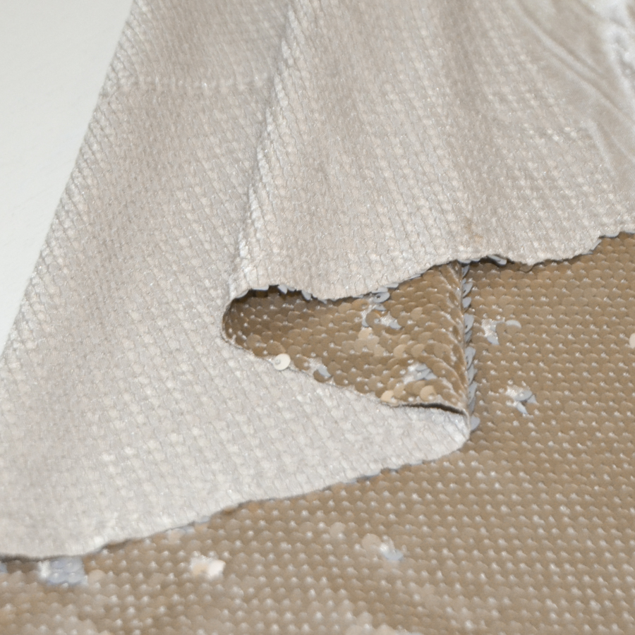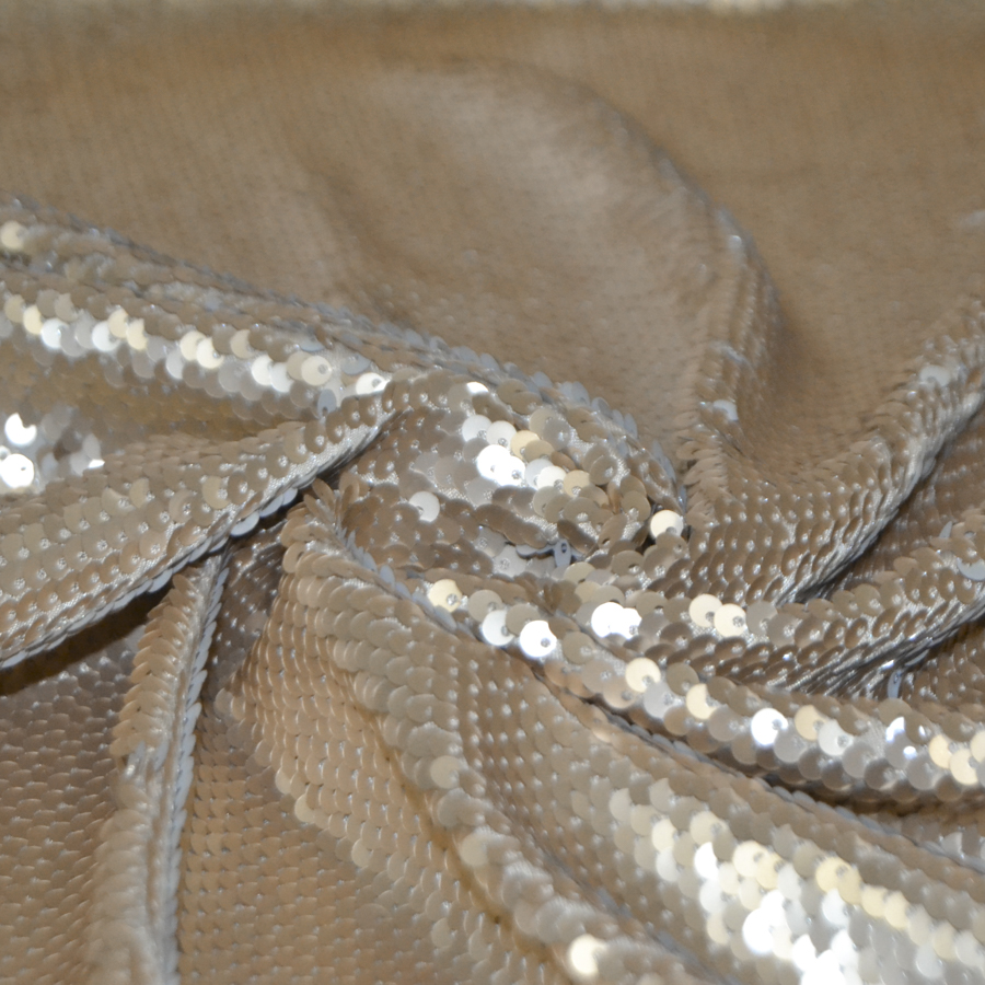 Матовые пайетки бежевого цвета, словно мерцающая россыпь песка, украшают тонкую трикотажную основу.