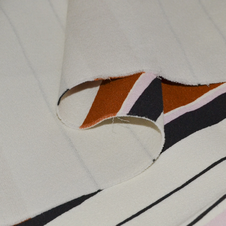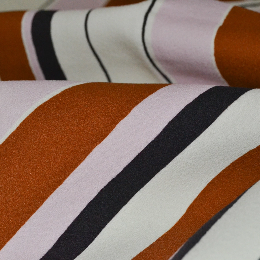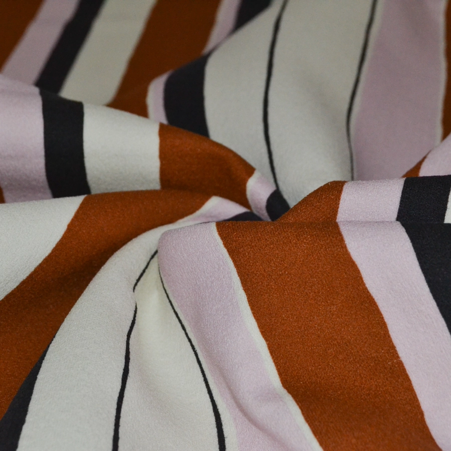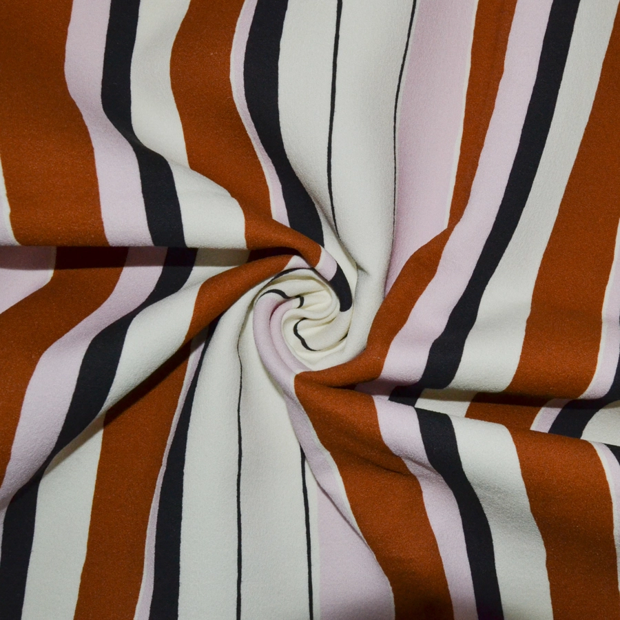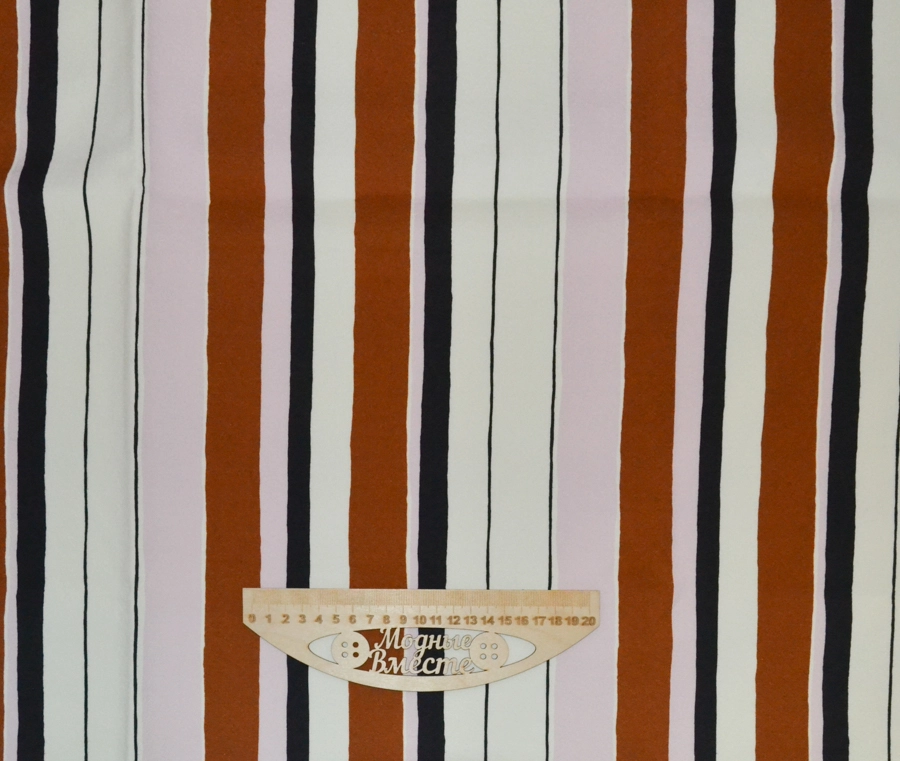 Плотный креп из вискозы молочно-белого цвета с вертикальными полосами разной ширины черного и терракотового оттенков.